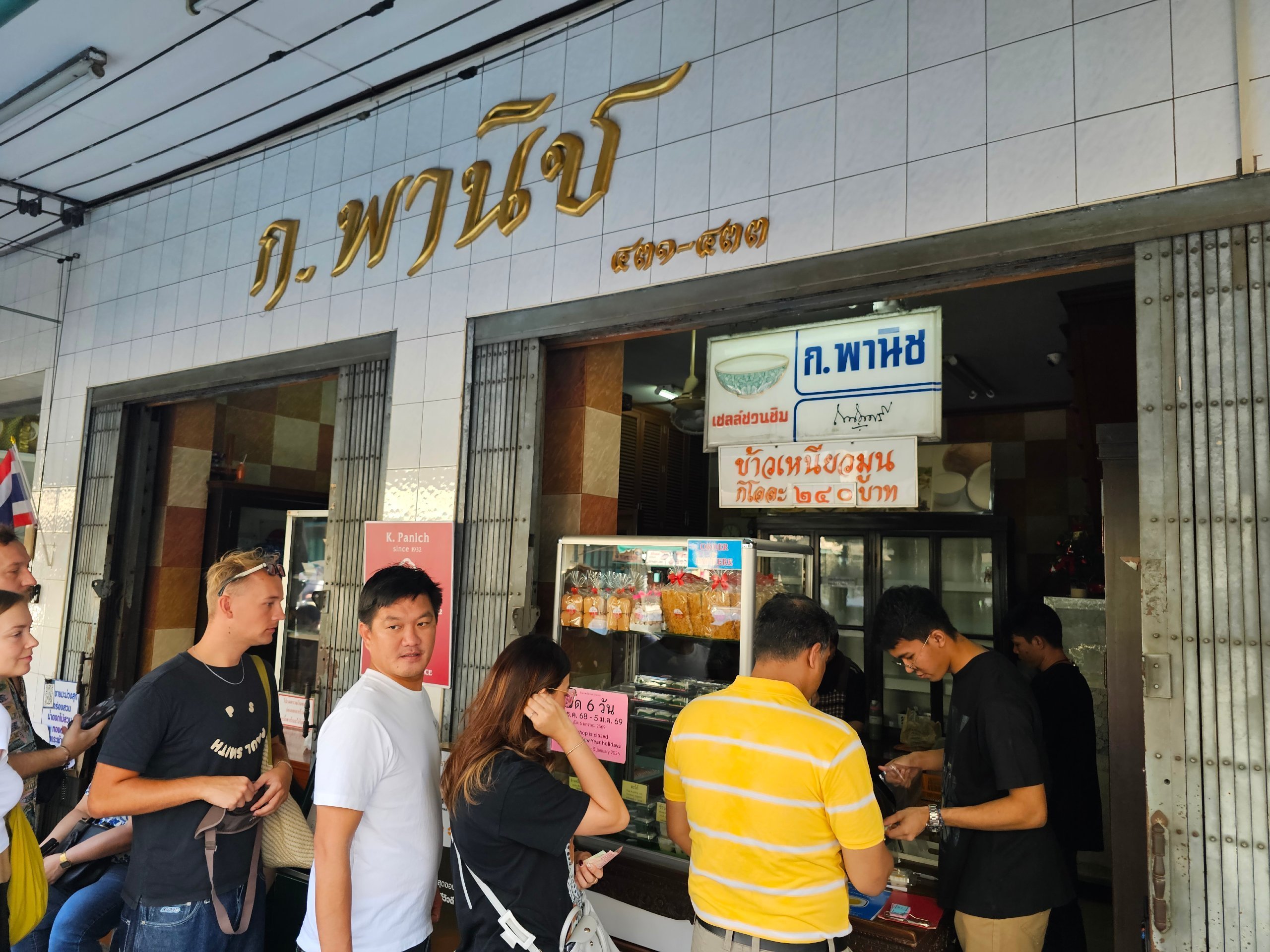 Bistronun caddeye bakan bir penceresi ve oturmak için küçük bir odası var. Orası çok kalabalıktı, bu yüzden mango yapışkan pilavımızı ve geleneksel Tay pudingimizi yandaki kaldırımda yedik.