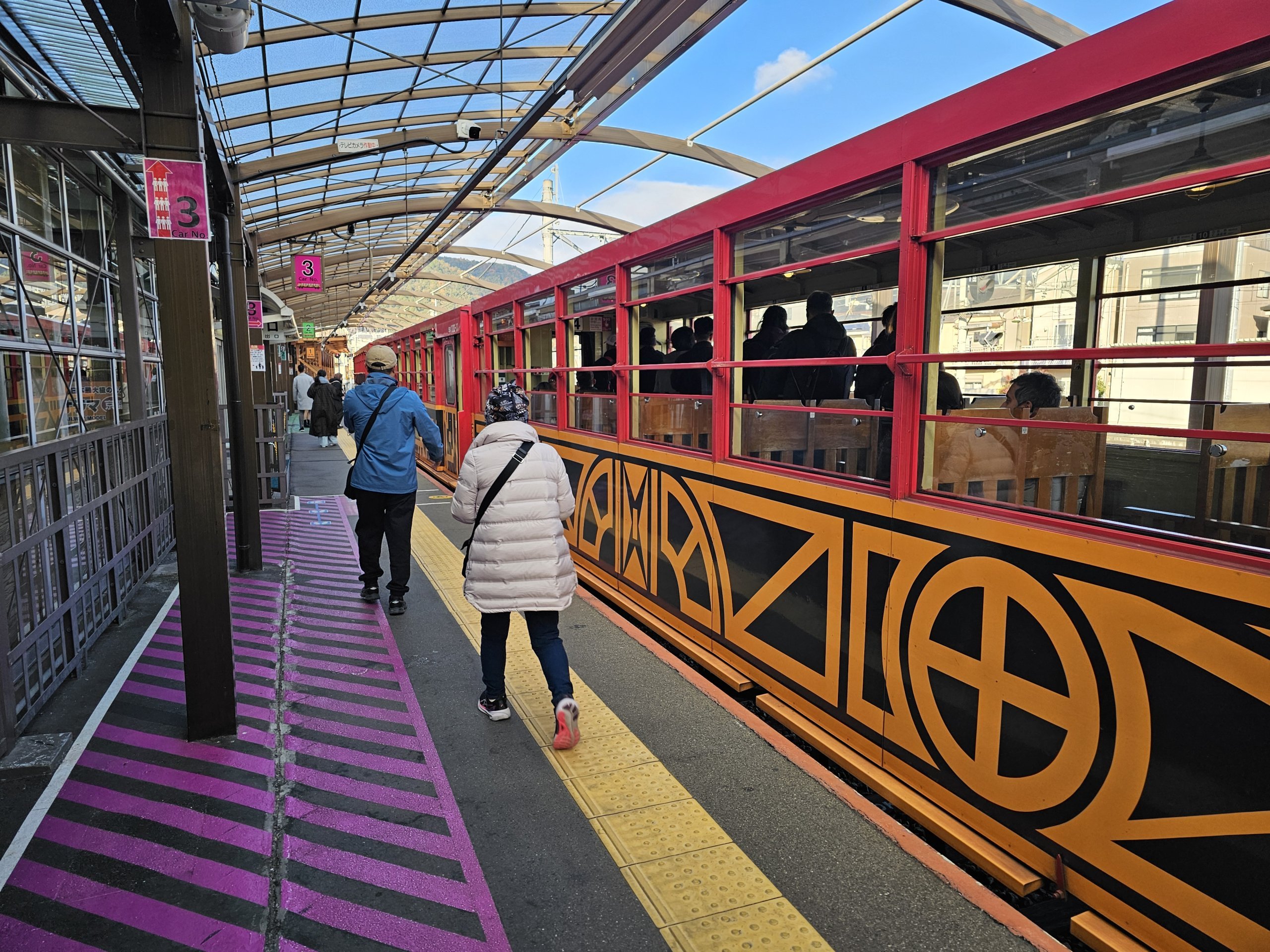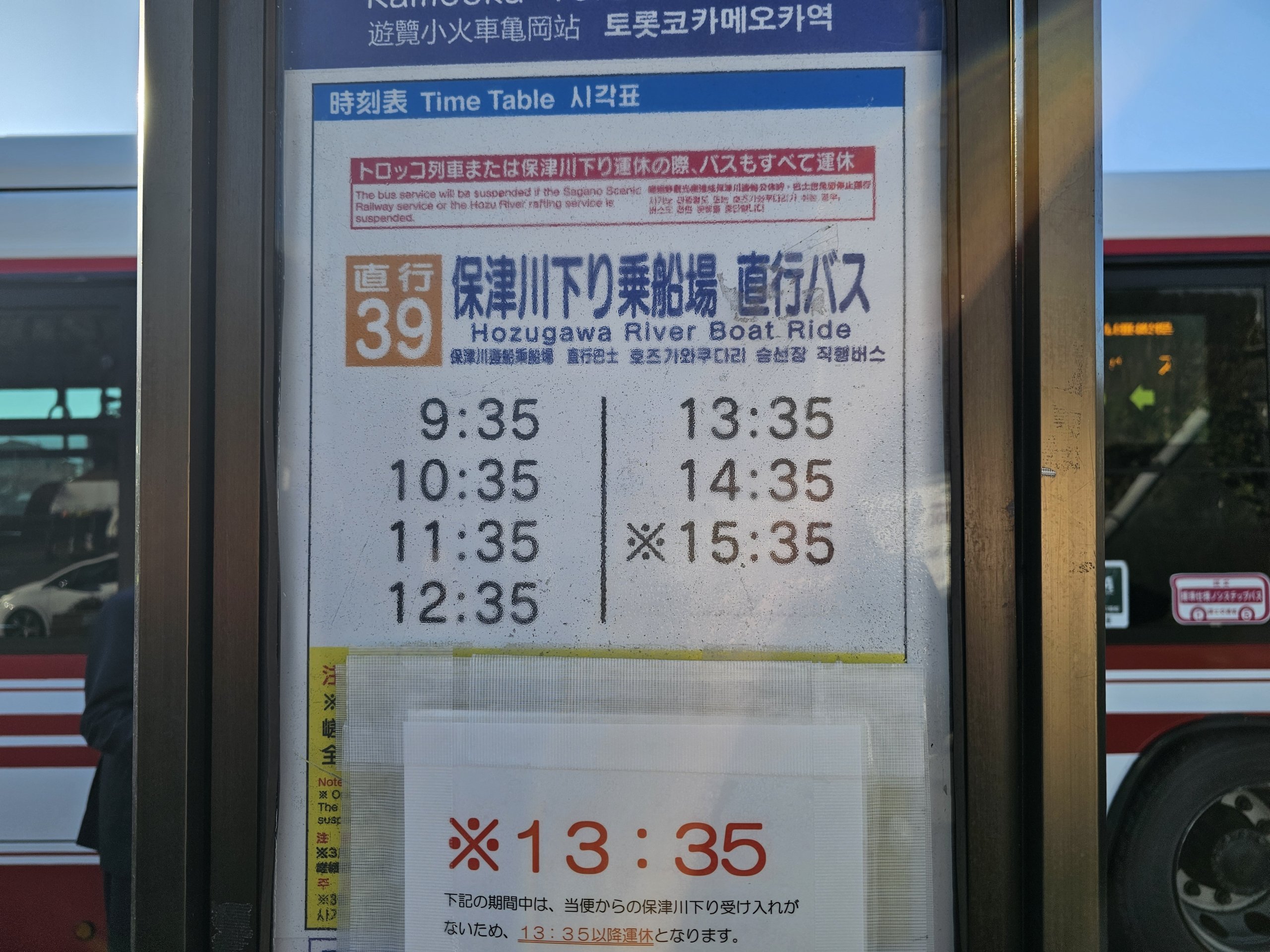 Romantik Sagano treninden, 39 numaralı otobüs hattı her trene bağlanarak doğrudan rıhtıma gidiyor ve seyahat süresi yaklaşık 10 dakika. Otobüs ücretini nakit ya da ulaşım kartı (ICOCA, Suica ya da başka bir kart) ile ödeyebilirsiniz.