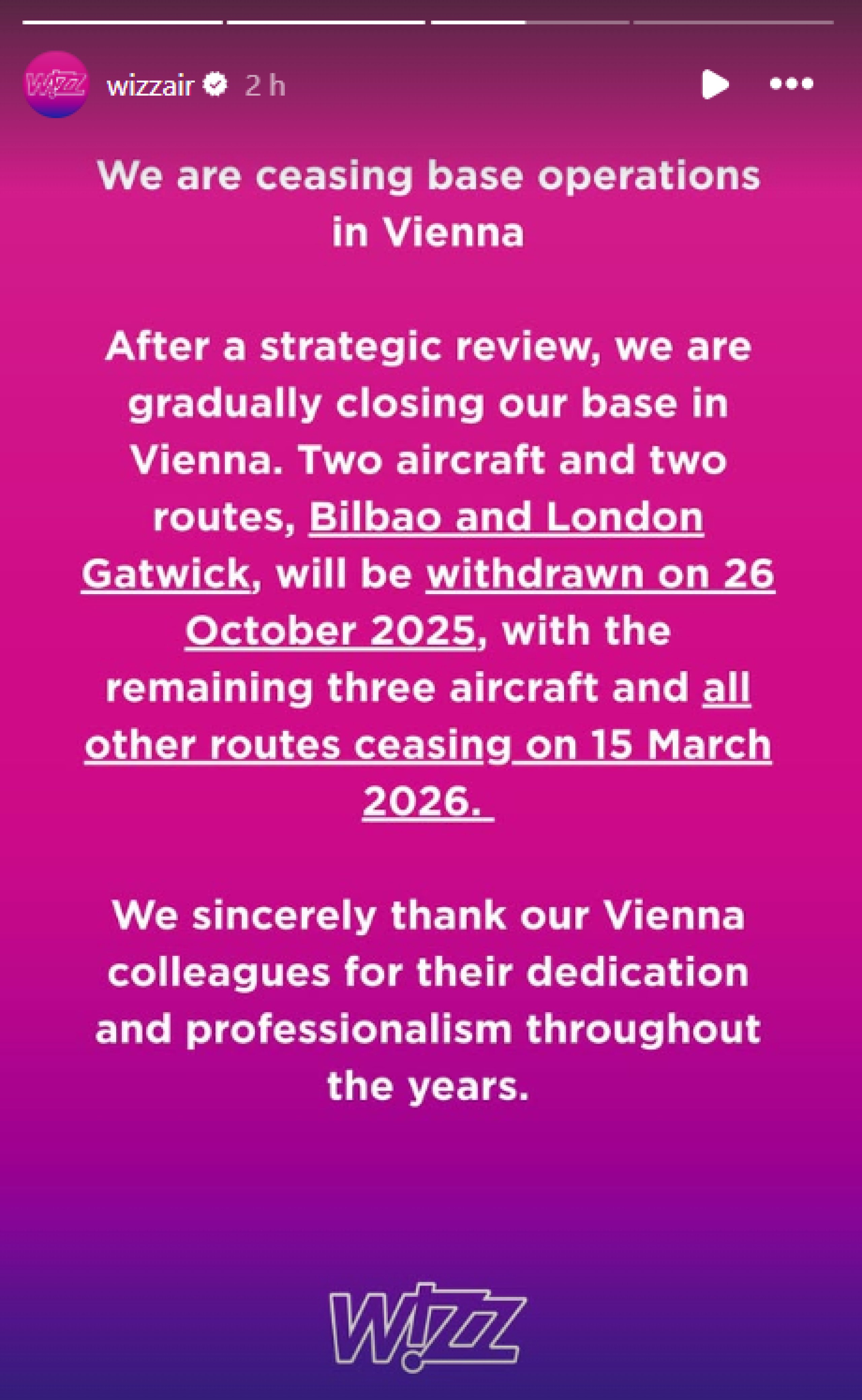 Wizz Air bugün Instagram profilinden yaptığı açıklamada, şu anda 5 uçağının bulunduğu Viyana'daki üssünü kapatacağını duyurdu.