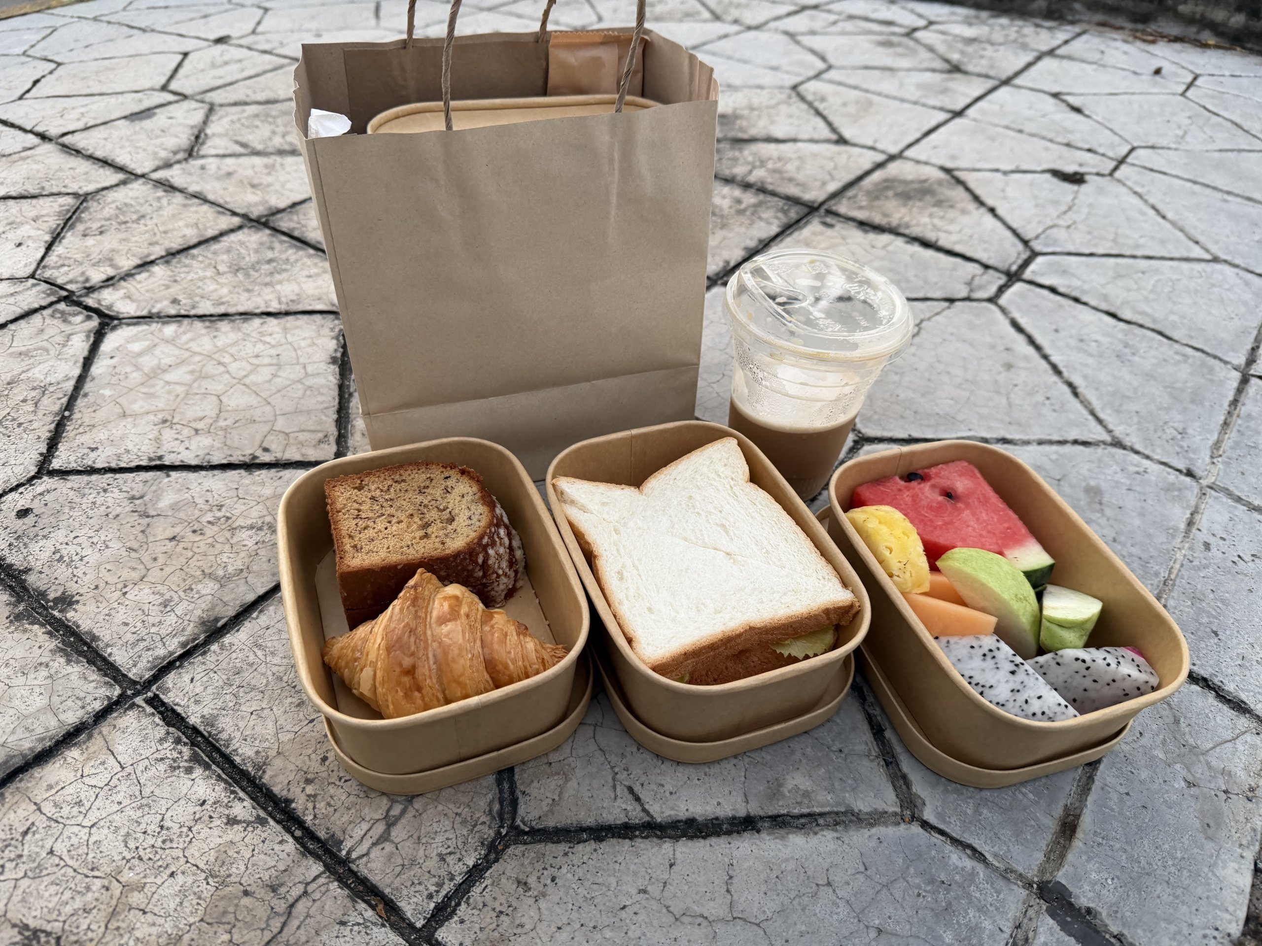 Ön büro bize kendi paket servis kahvaltı kutusu seçeneğini sundu. Paketin içinde kahve, iki parça kızarmış ekmek ve meyve vardı. Oldukça basit, ancak sabahın erken saatleri için yeterli ve çok hoş bir jest.