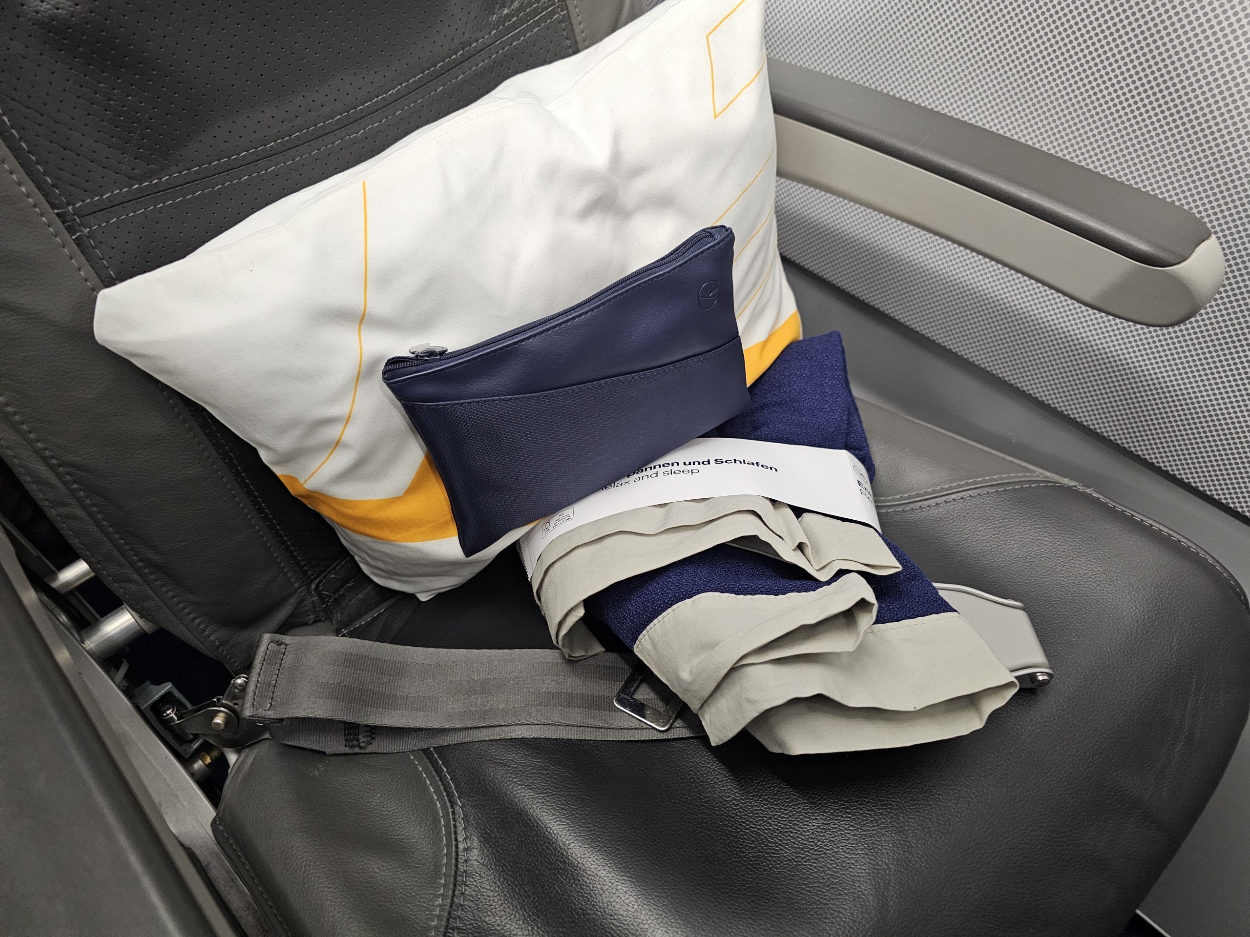 Ancak Lufthansa'da konfor kiti içeriği biraz daha zayıf ve yastık da daha küçük. Çantanın içinde şunları buldum: