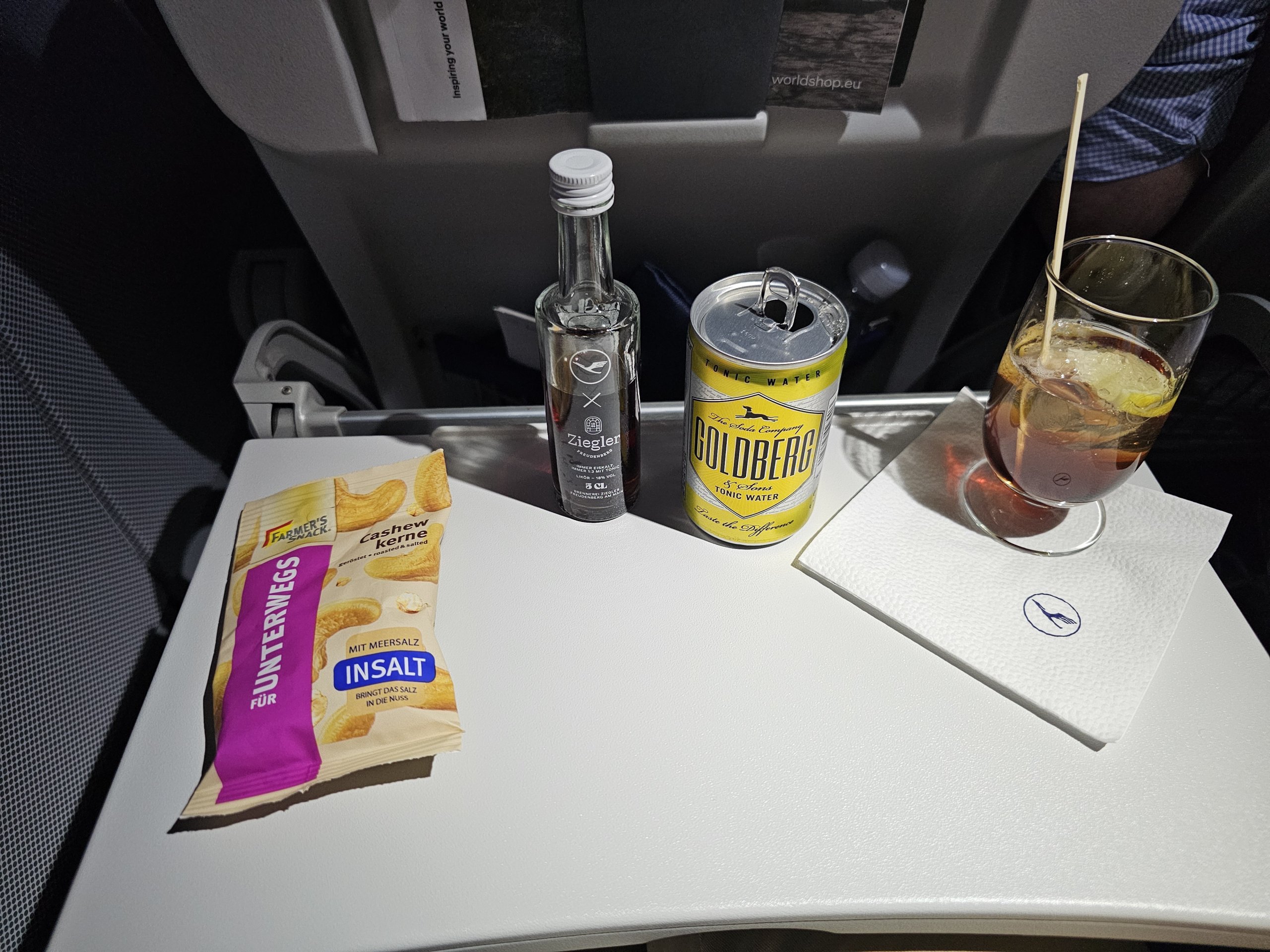 Kalkıştan yaklaşık 20 dakika sonra, ilk servis bir içecek ve bir torba bisküvi şeklinde gelir. Tabii ki en sevdiğim Lufthansa imzalı kokteylim Avionic var.