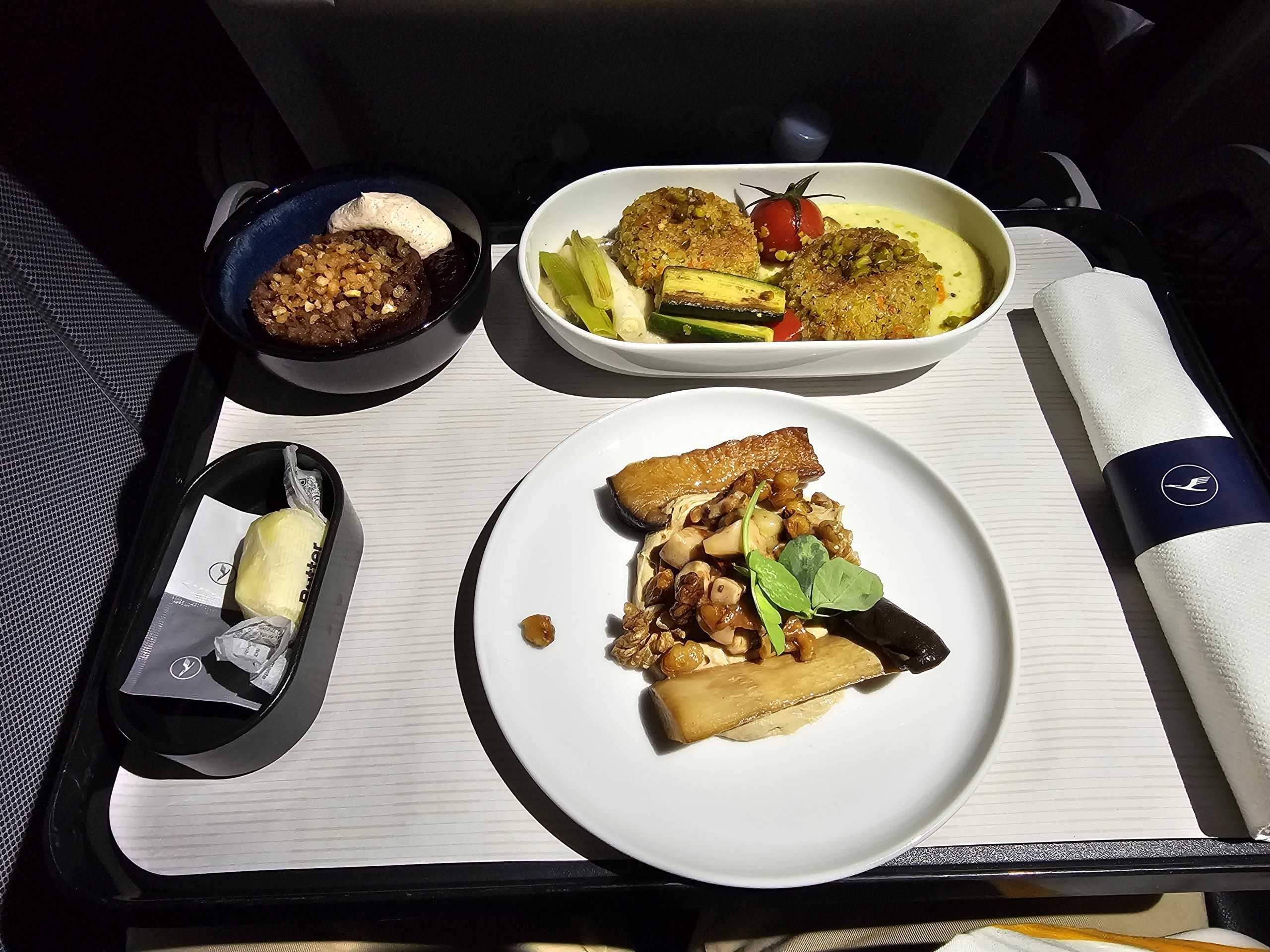 Uçakta daha iyi yemekler yedim, kinoa kurutulmuş ve ekmek kırıntıları ile, bu yüzden yemek beklediğim kadar hafif değil. Ancak mantar mezesi harika ve erik crumble da lezzetli,