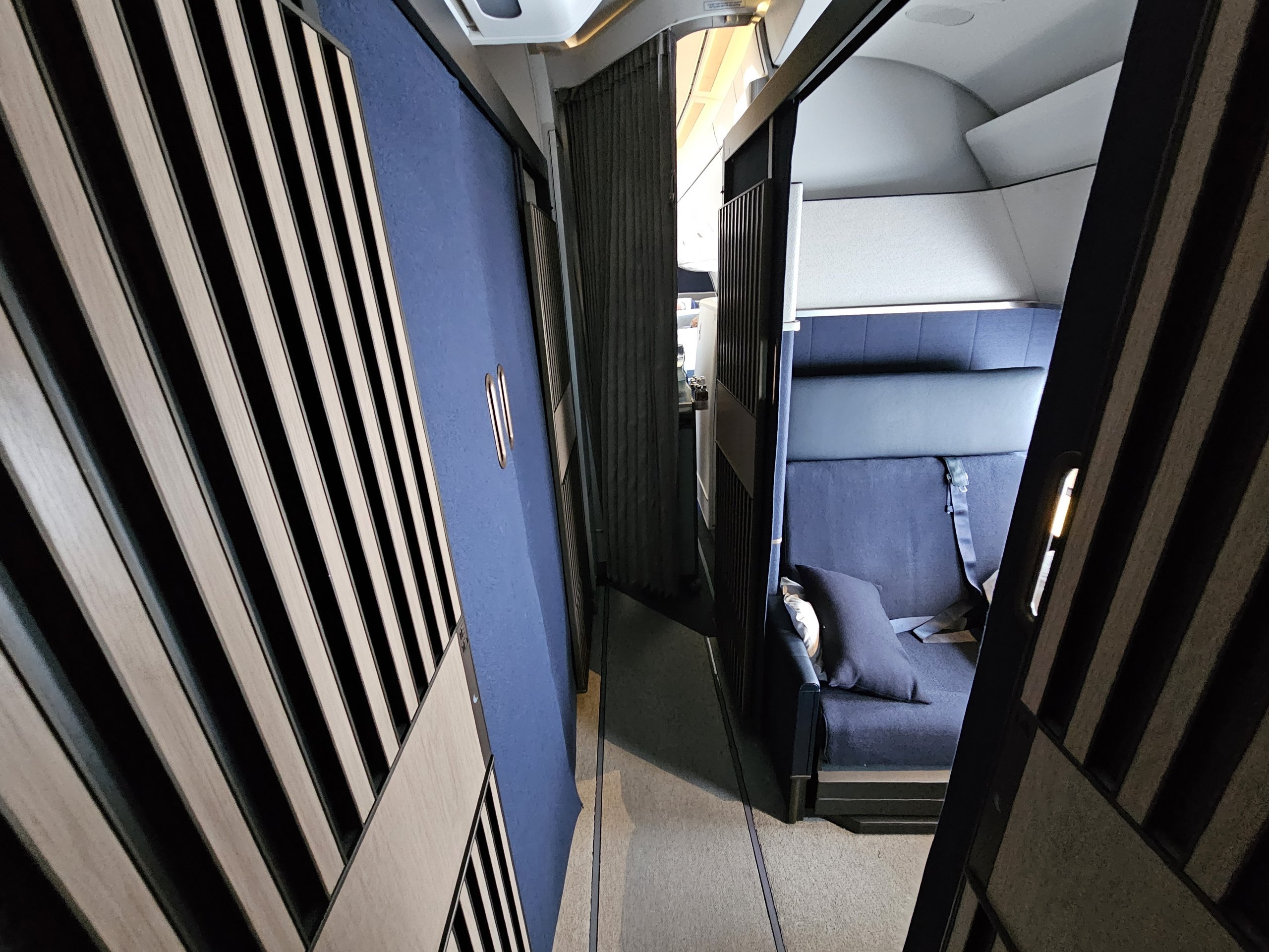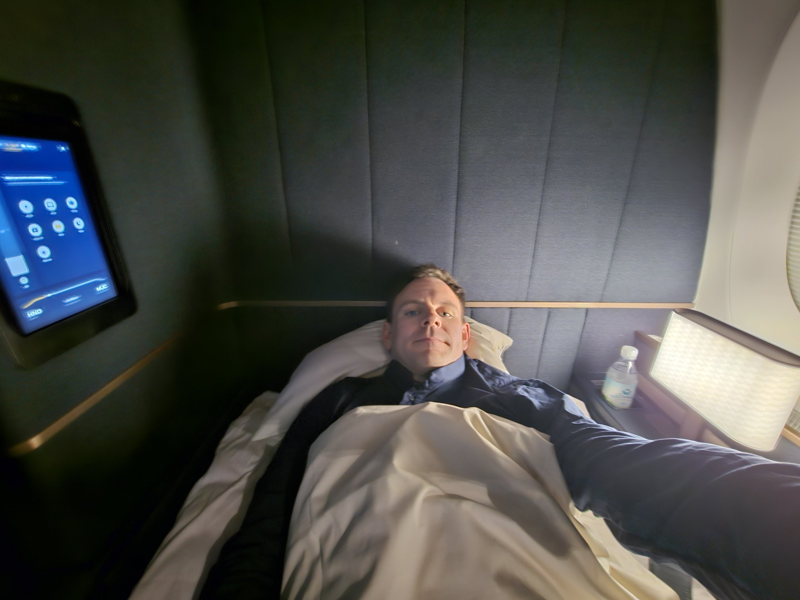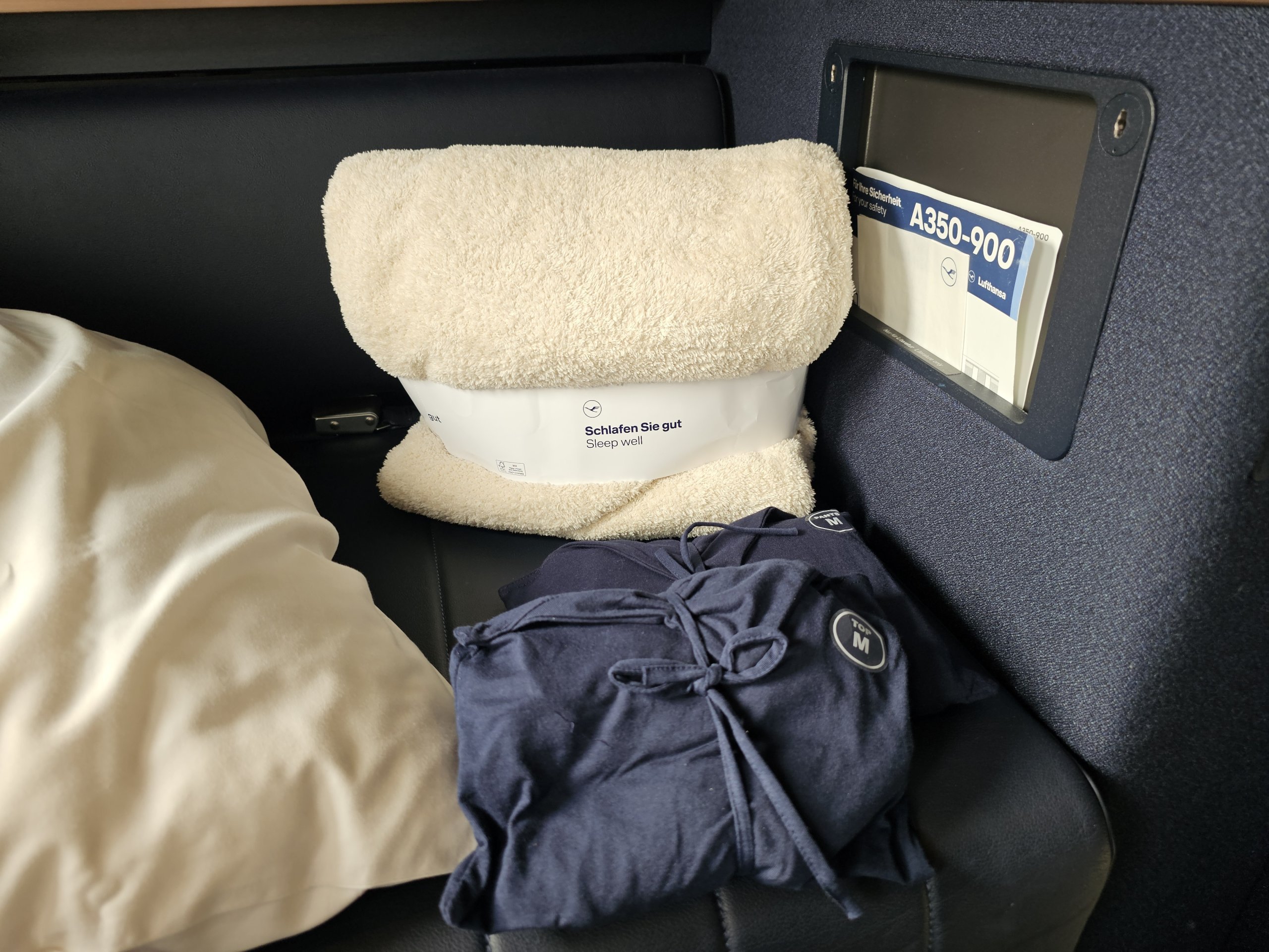 Öğle yemeğinden kısa bir süre sonra pijamalarımı giymek için tuvalete gidiyorum. Bu arada yardımsever bir görevli yatağımı hazırlıyor (bir düğmeye dokunarak koltuğu kendiniz açabiliyorsunuz, ancak çarşaflar ve battaniye sadece mürettebatın erişebileceği bölmelere yerleştiriliyor).