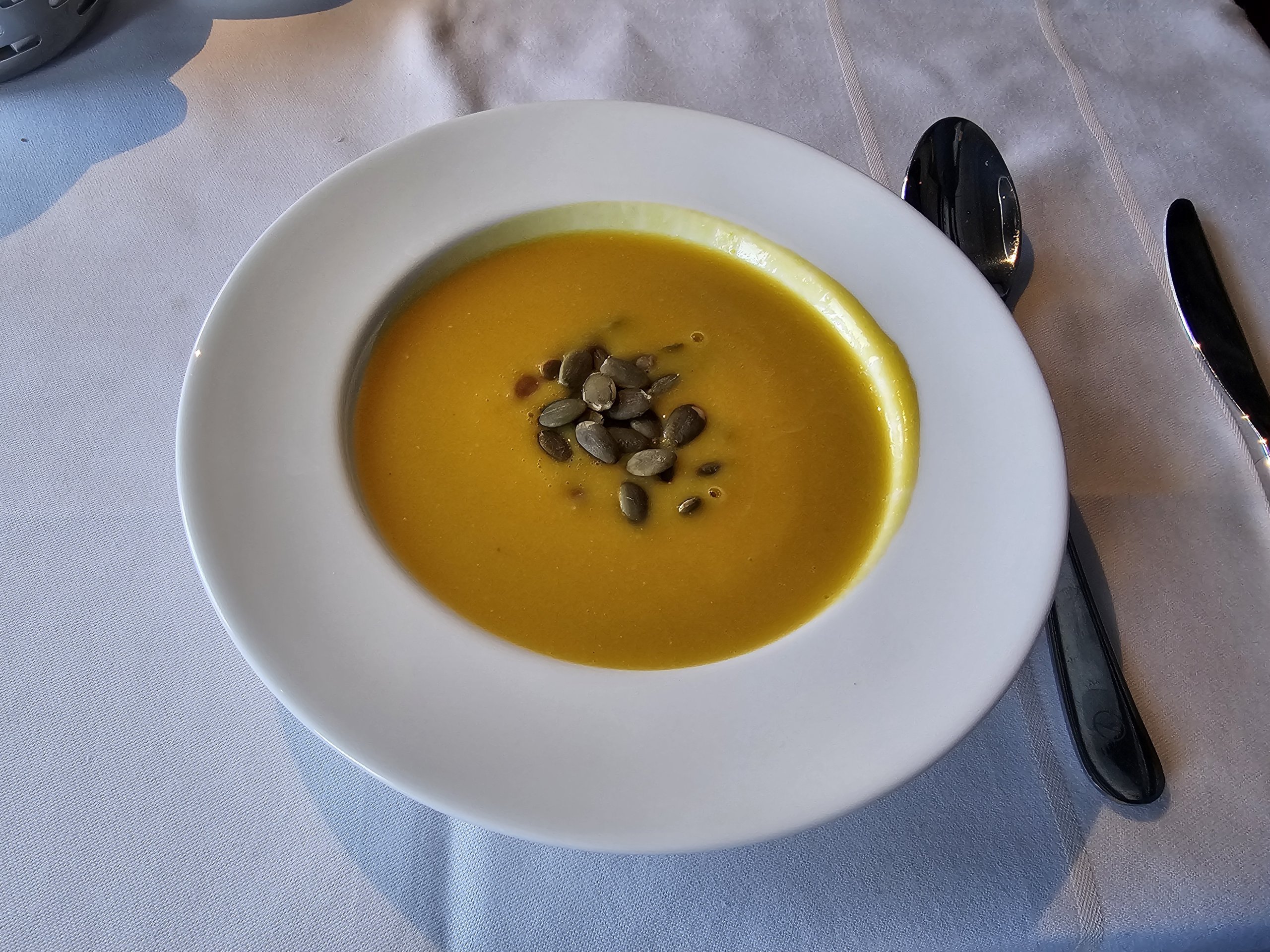 Yemekten önce harika bir balkabağı ve zencefil çorbası içiyorum.