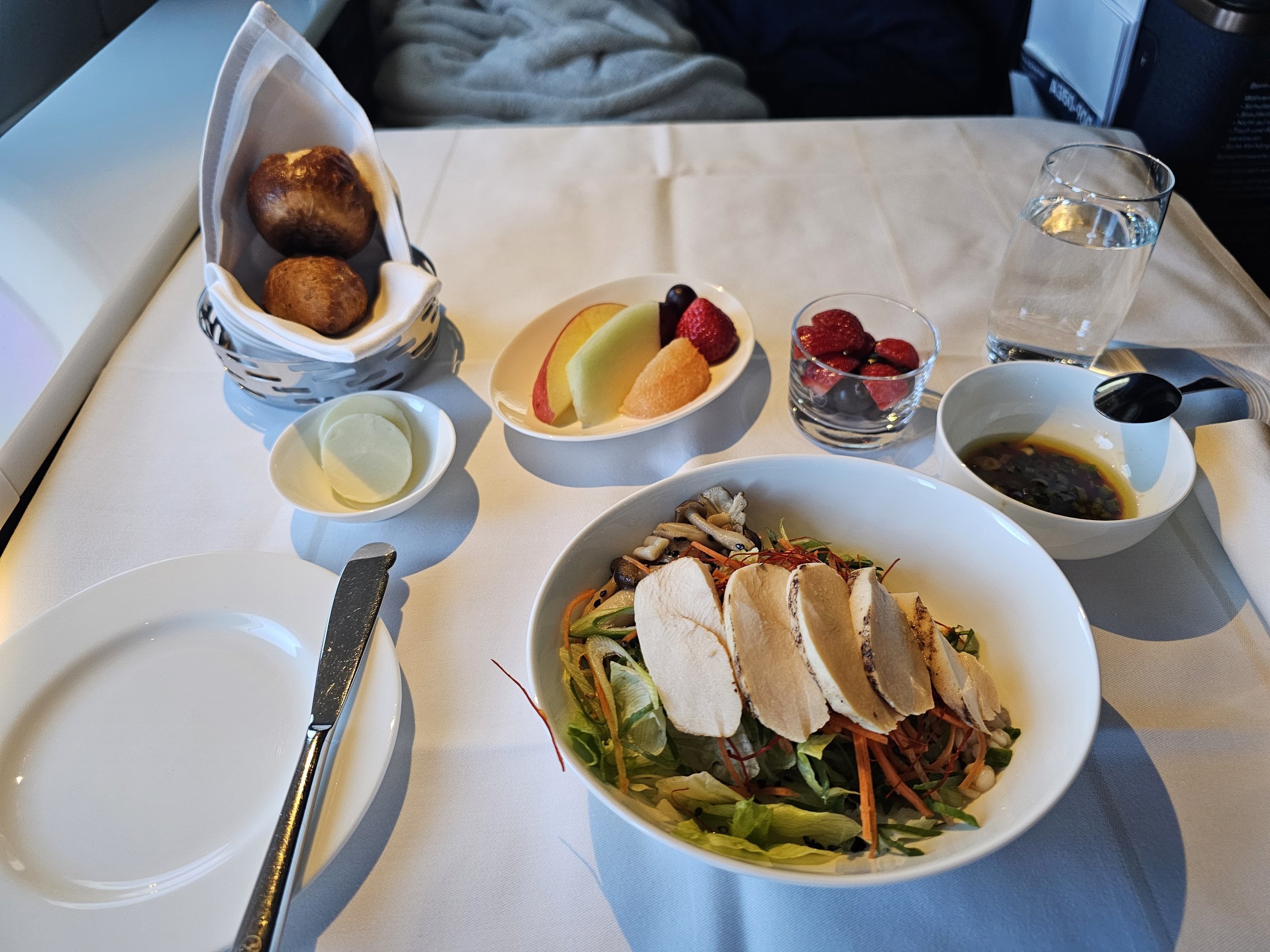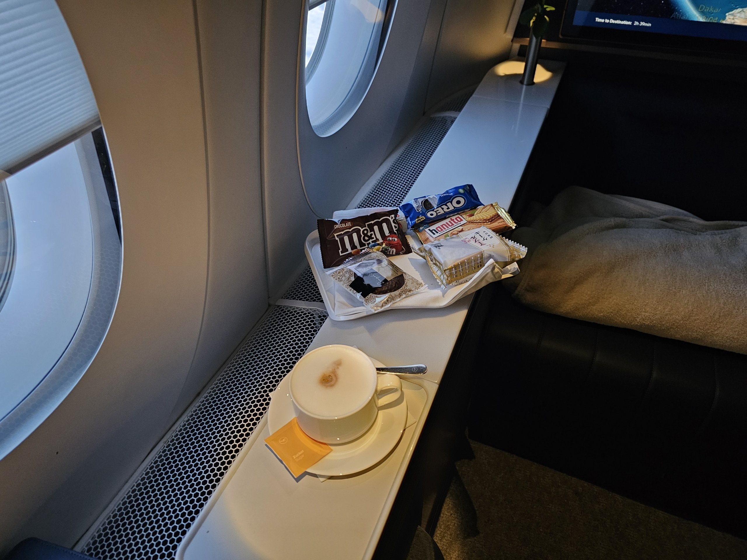 Kahvaltı yiyecekleri biraz zayıf, ama bu benim için sorun değil çünkü Frankfurt'tan Japonya'ya uçtuğumdan beri Lufthansa'daki First Class hizmetinin fazlasıyla yeterli olduğunu zaten biliyorum.