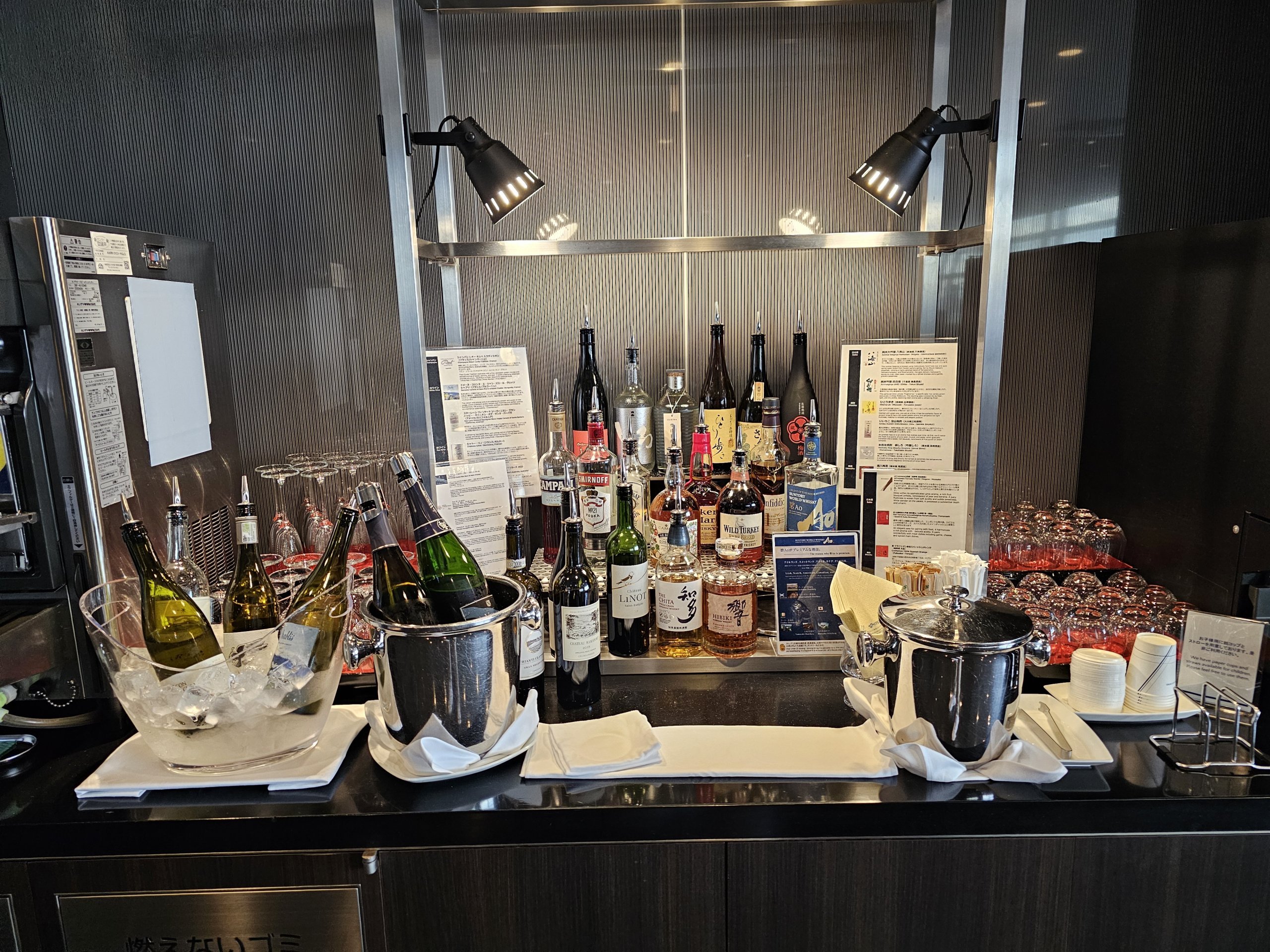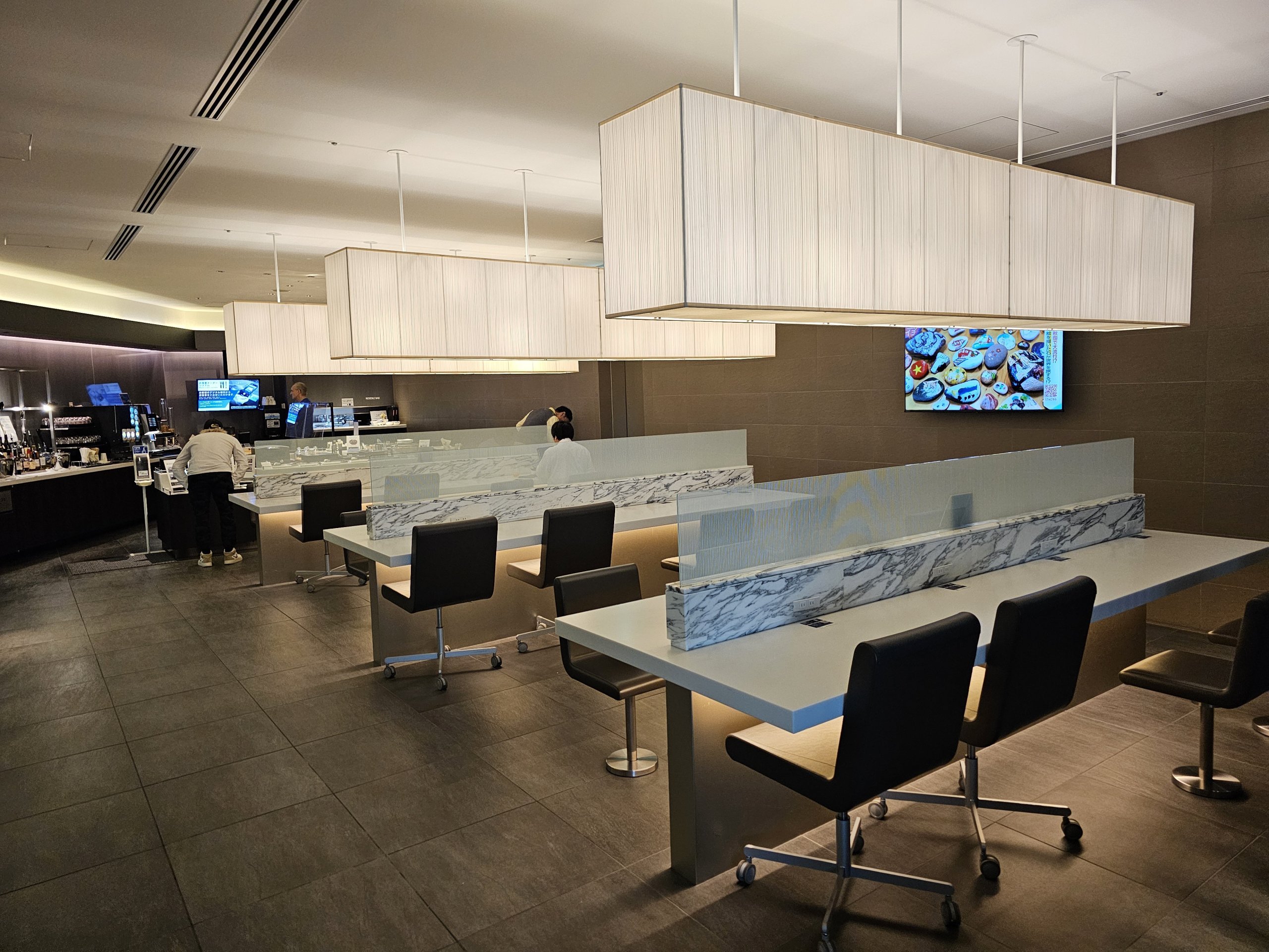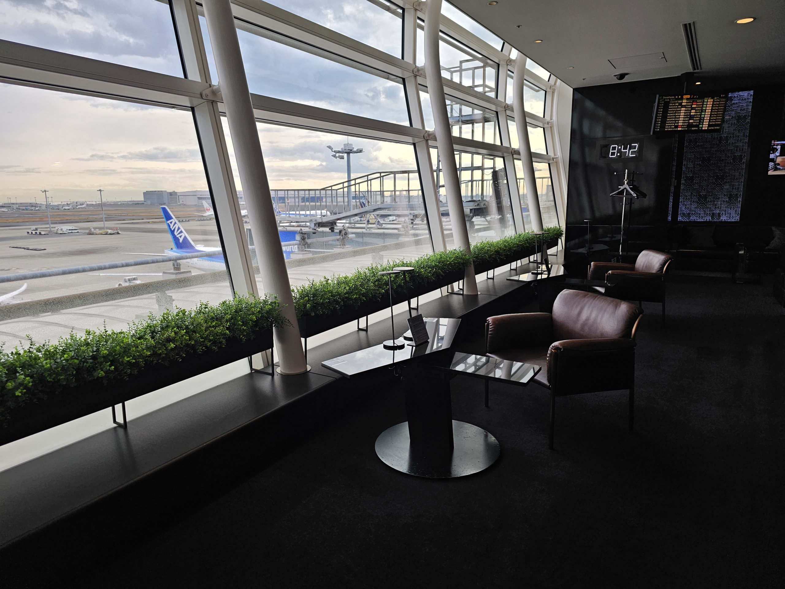 Salon, harika bir pist manzarası ve ANA Japan Airlines'ın birinci sınıf koltuklarını taklit eden çok sayıda kabin ile çok geniştir.