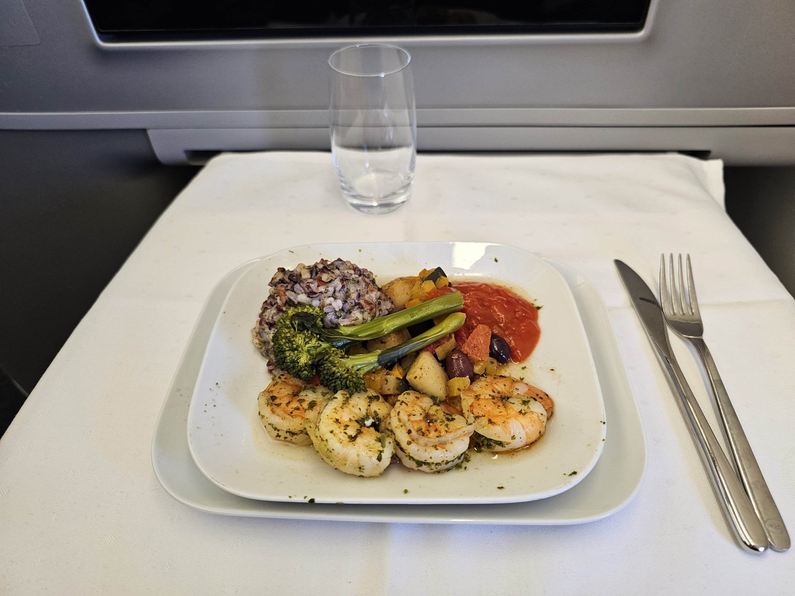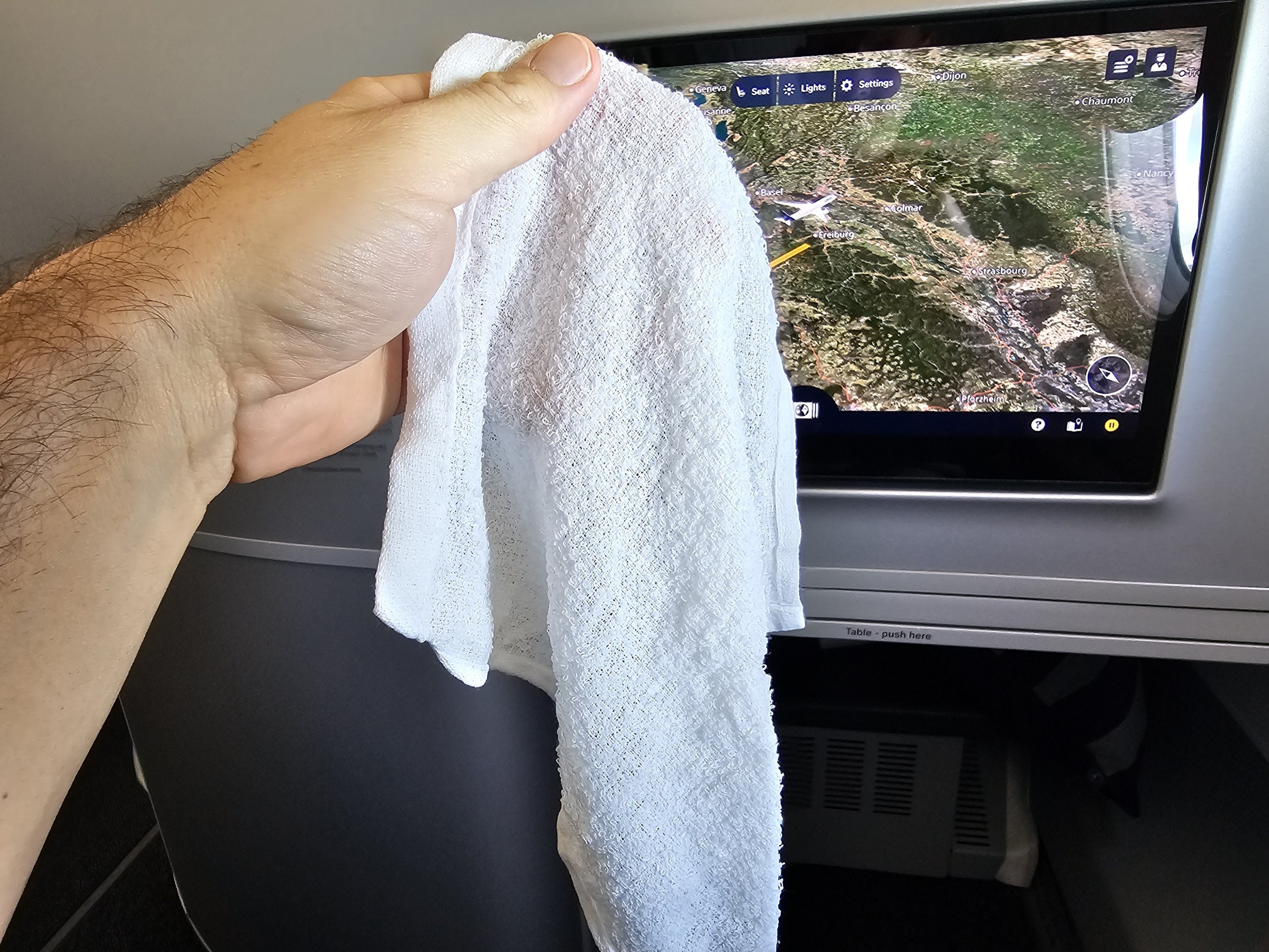 Ana yemek kalkıştan yaklaşık bir saat sonra geliyor. Yemekten önce, inişten önce bir kez daha dağıtılan geleneksel sıcak ıslak peçeteyi alıyoruz.