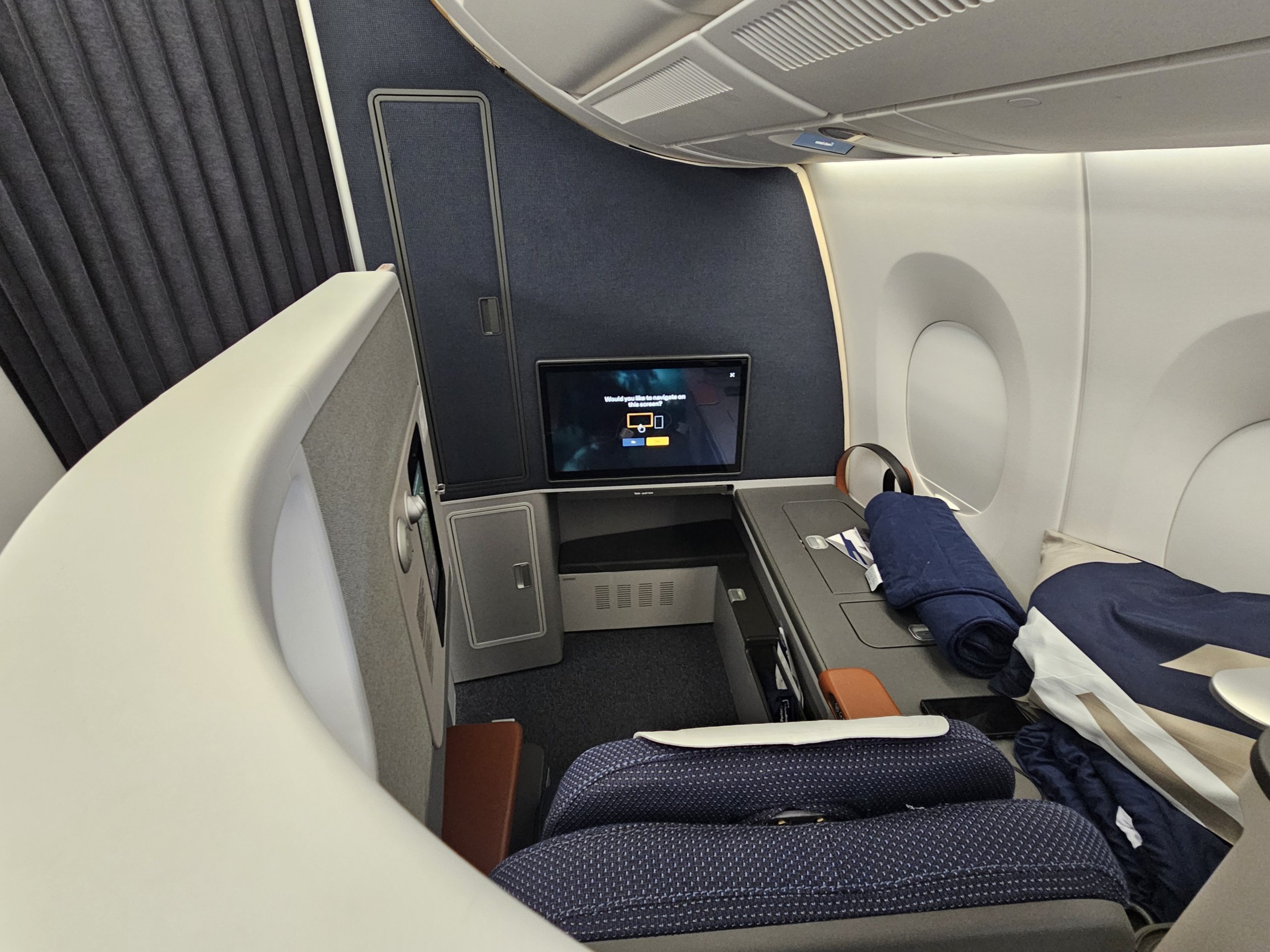 Sadece birkaç aylık bir Airbus A350-900 ile uçuyoruz ve business class kabin ilk bakışta yeni ve modern görünüyor.