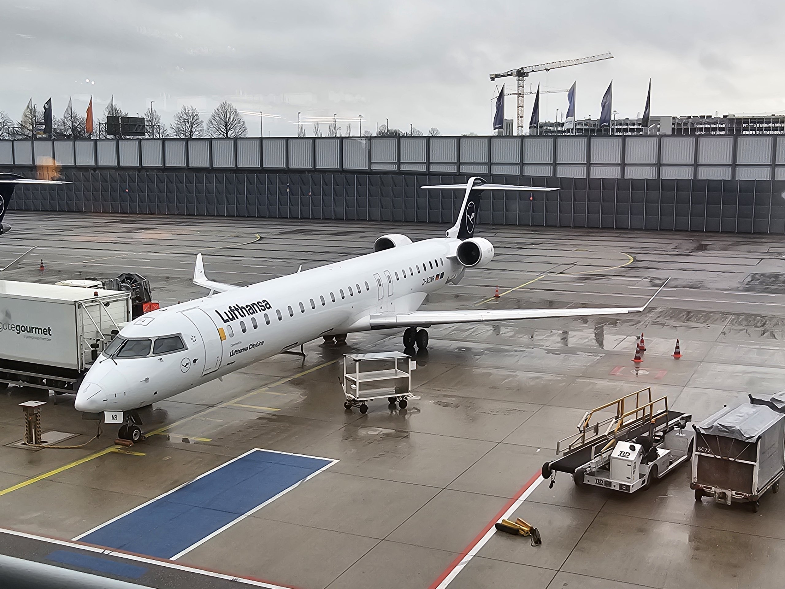 Uçağa binmeden yaklaşık 15 dakika önce uçağa doğru yola çıkıyorum. Lufthansa filosundaki en küçük uçak olan Bombardier CRJ-900 ile uçuyoruz, yani uçağa biniş köprüsünden değil, yürüyerek biniyoruz.