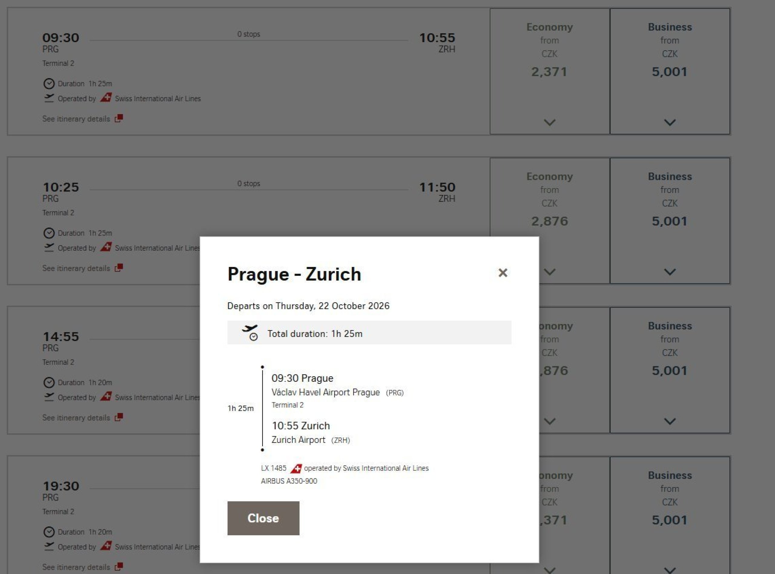 Swiss International Air Lines ile Airbus A350 ve Premium Economy ile Prag - Zürih rotasında uçmak mı? Rezervasyon sisteminde bir hata var gibi görünüyor.