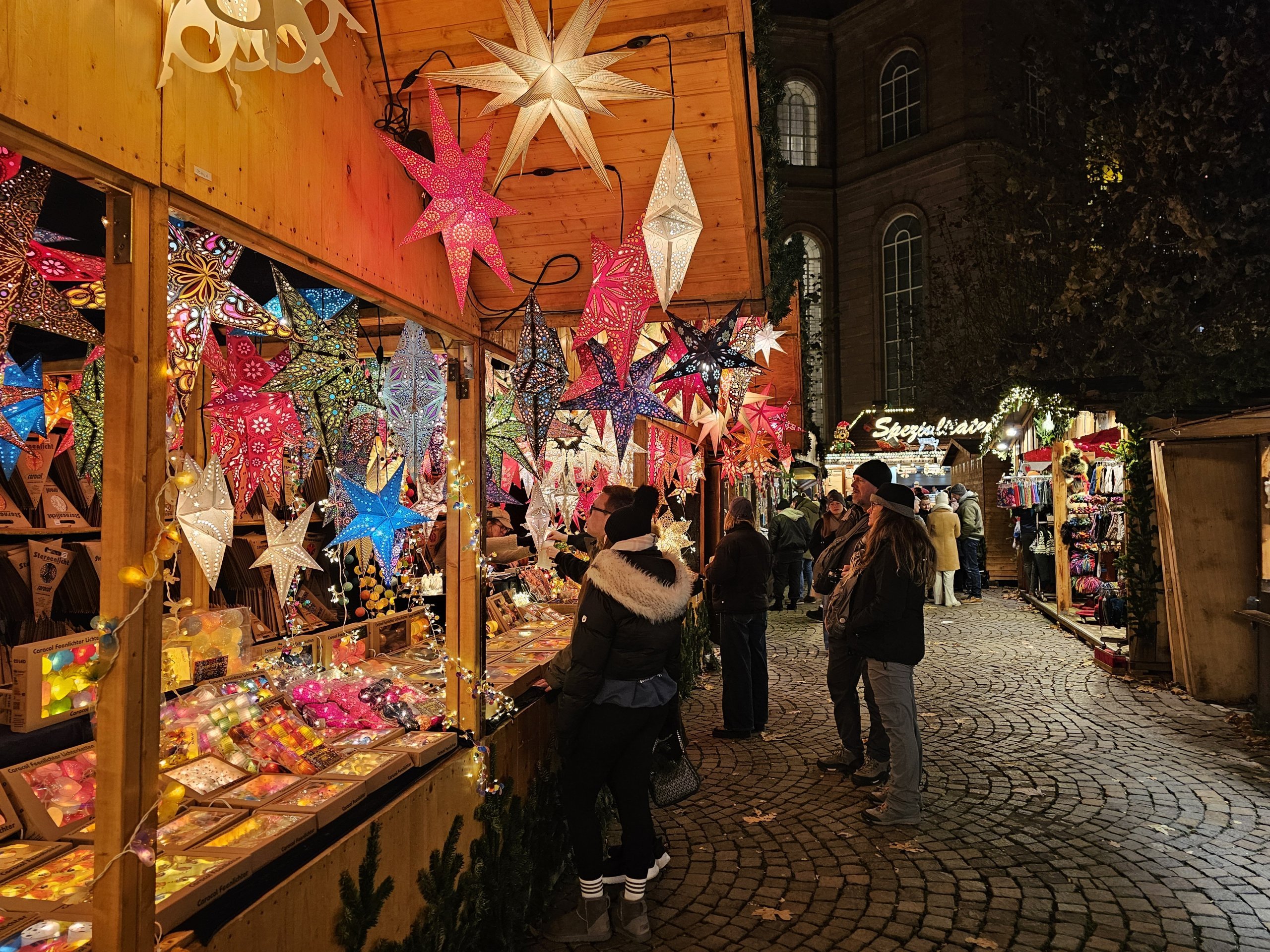 Paulskirche'nin önündeki Römerberg'den sadece birkaç adım ötede, Noel pazarı daha fazla tezgah ve tamamen farklı bir atmosferle devam ediyor.