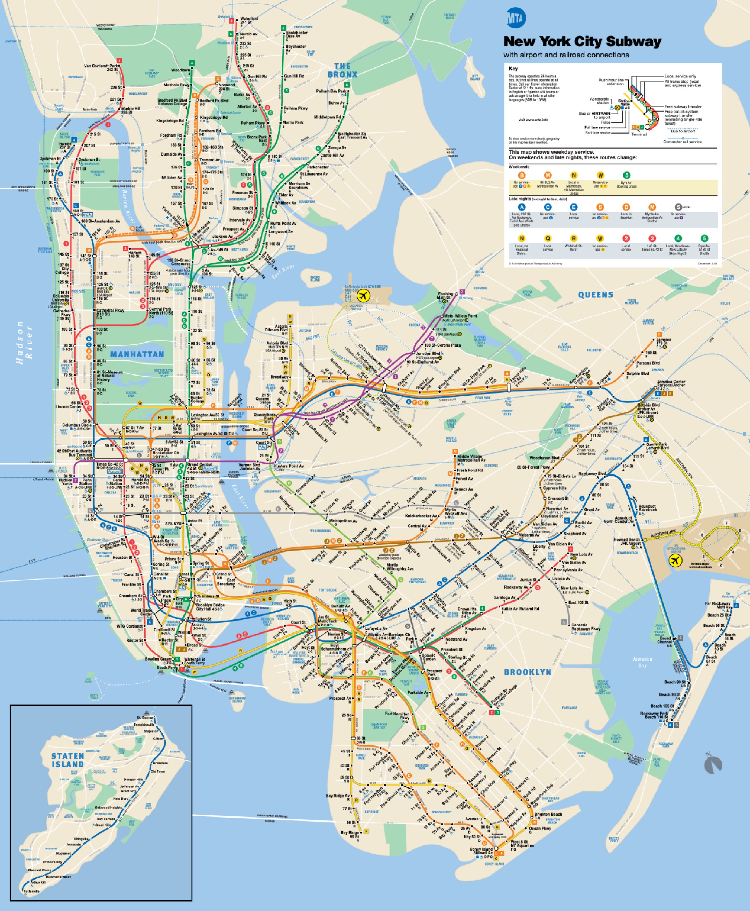 Genişliği nedeniyle New York Şehri'ne harfler ve renklerle ayırt edilen 25 hat hizmet vermektedir.