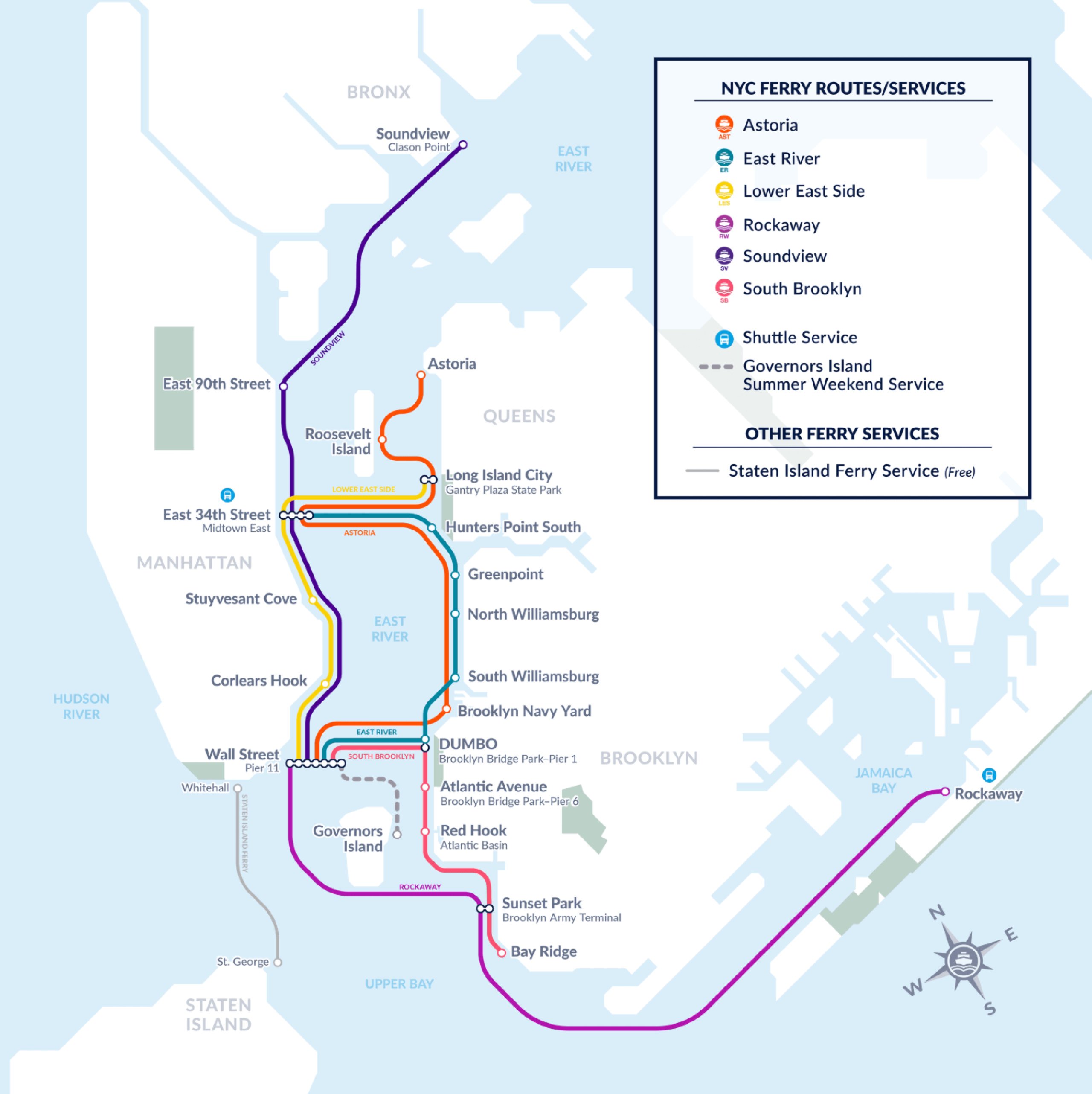 New York City ziyaretinizi sudan bir gösteri ile renklendirin. Şu anda Manhattan'ın doğu yakası boyunca 6 düzenli tekne hattı ve 1 özel Staten Island Feribotu bulunmaktadır, aşağıya bakınız.