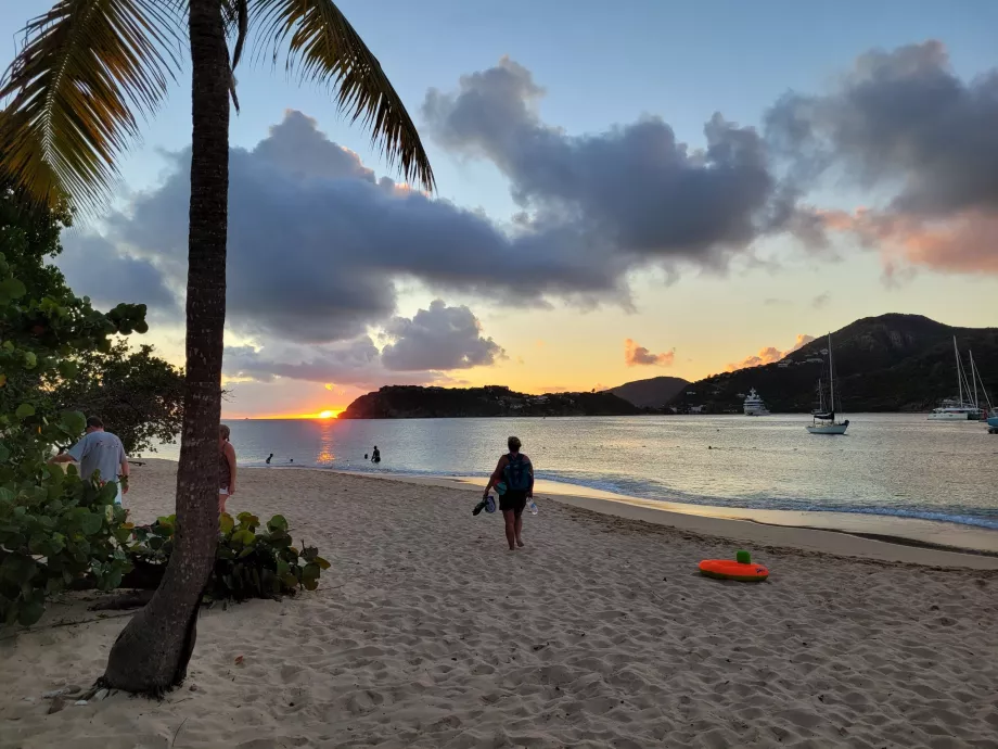 Pigeon Point Plajı, körfezin dar girişi ve komşu Montserrat adası üzerinden neredeyse tam olarak ufukta batan nefes kesici gün batımını izlemek için popüler bir noktadır.