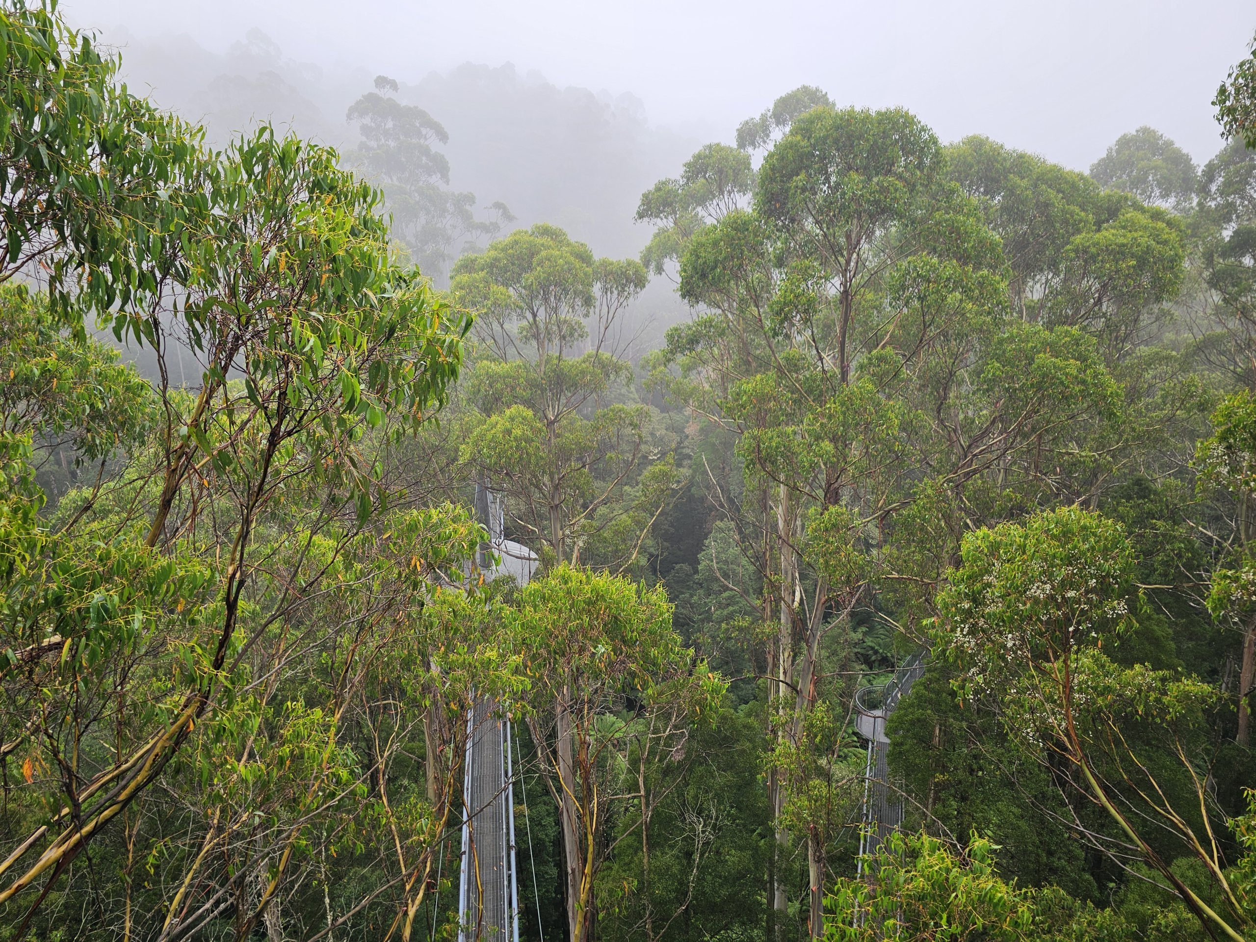 Ilıman ormanın görkemli ağaçlarını kuş bakışı izlemenin keyfini çıkarın ve tepelerinde yükselen okaliptüs ağaçlarının dallarına dokunun.