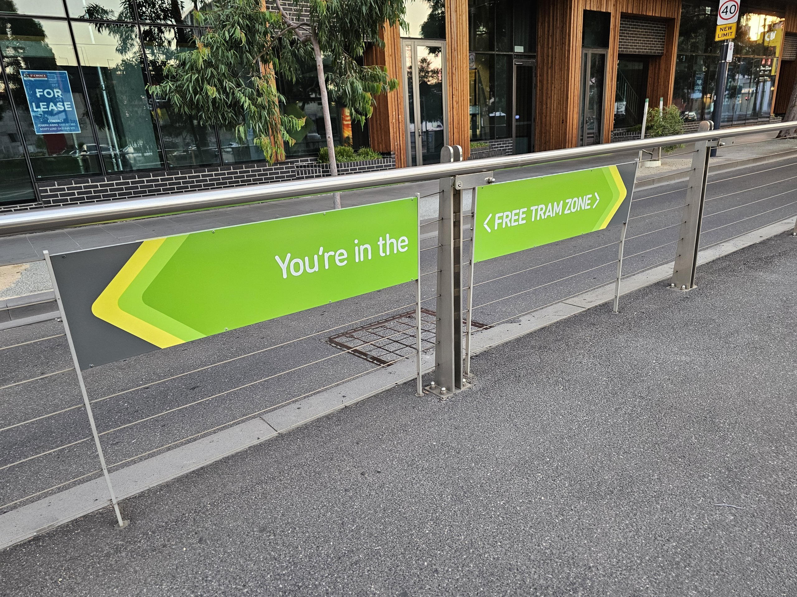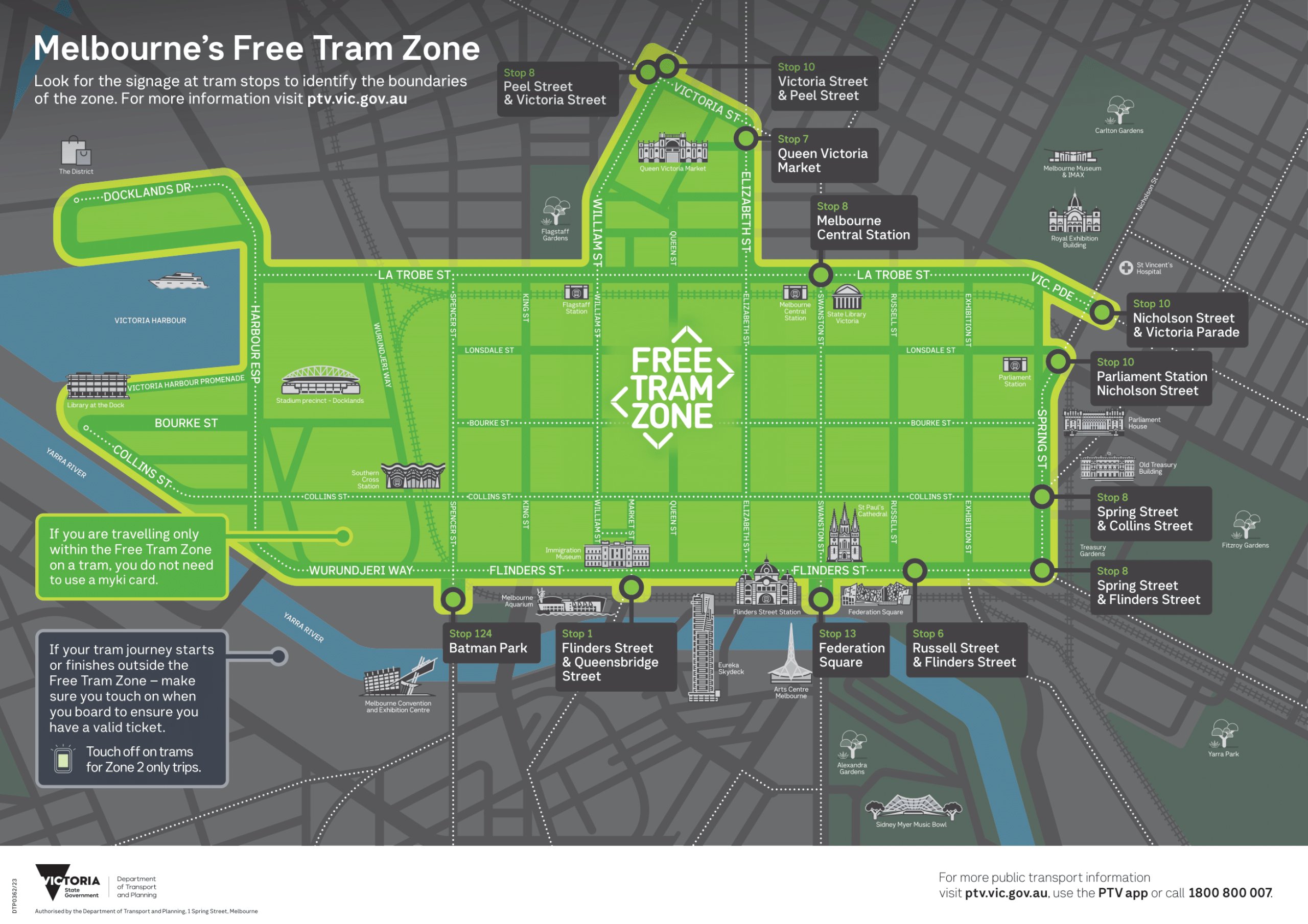 Tüm şehir merkezi ve Docklands bölgesi bu bölgenin bir parçasıdır ve yalnızca Ücretsiz Tramvay Bölgesi içinde tramvayla seyahat ederseniz ücret ödemezsiniz. Yani Myki kartınızı (ya da gelecekte kendi temassız kartınızı) okuyucuya takmanıza hiç gerek kalmayacak.