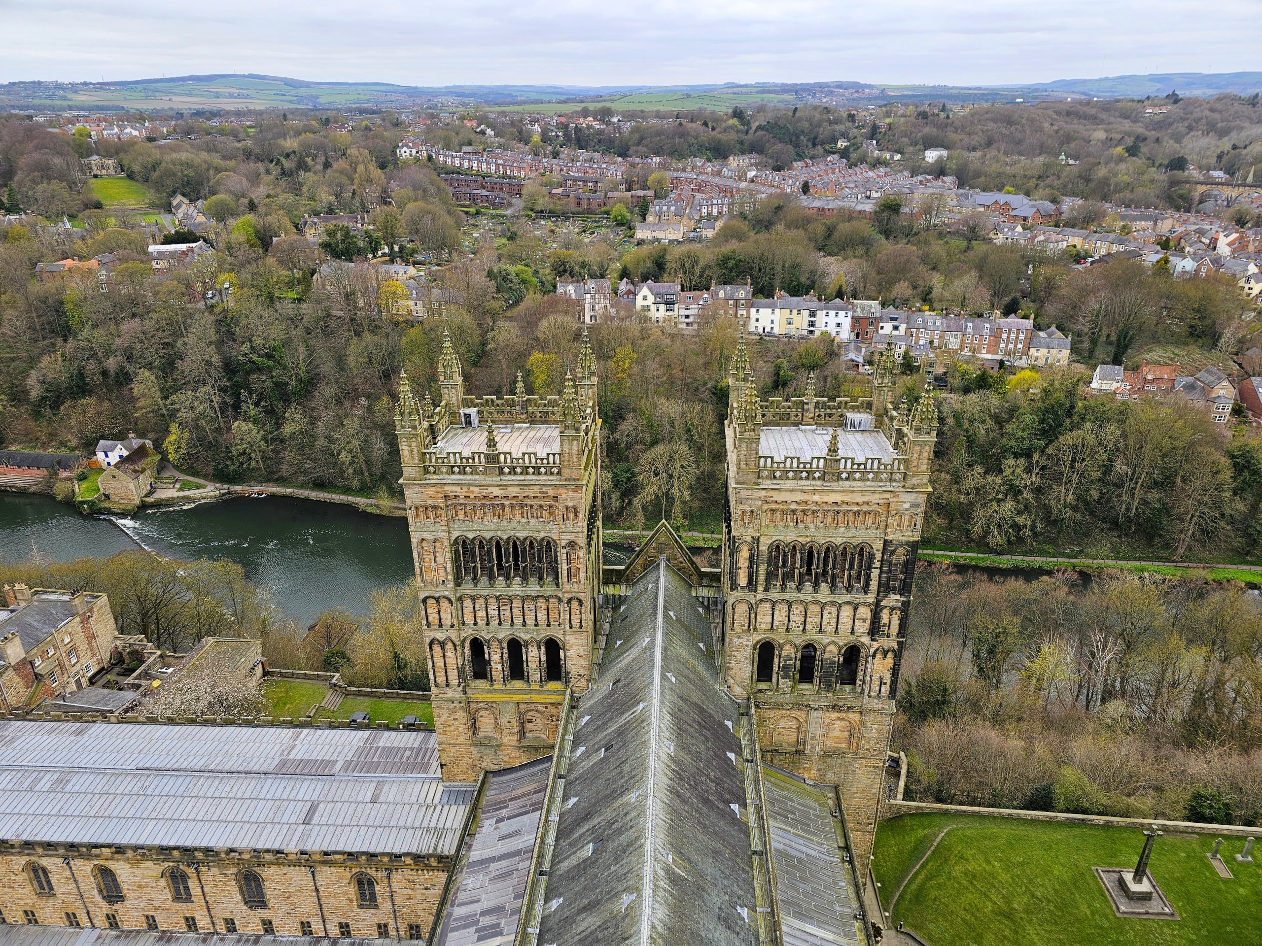 Muhteşem merkez, Wear Nehri'nin bir kıvrımıyla oluşan bir yarımada üzerinde yer alır ve şehrin iki ana anıtı en yüksek noktasında bulunur:
