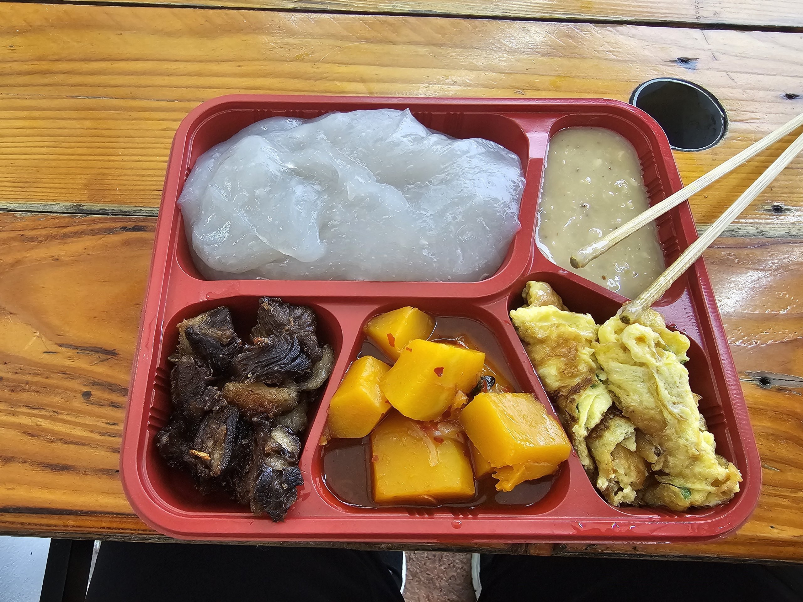 Bu, palmiye ağaçlarının iç kısmından elde edilen, bambu çubuğa sarılan ve ekşi baharatlı bir sosa batırılan, tamamen tatsız, yapışkan nişastalı bir lapadır.