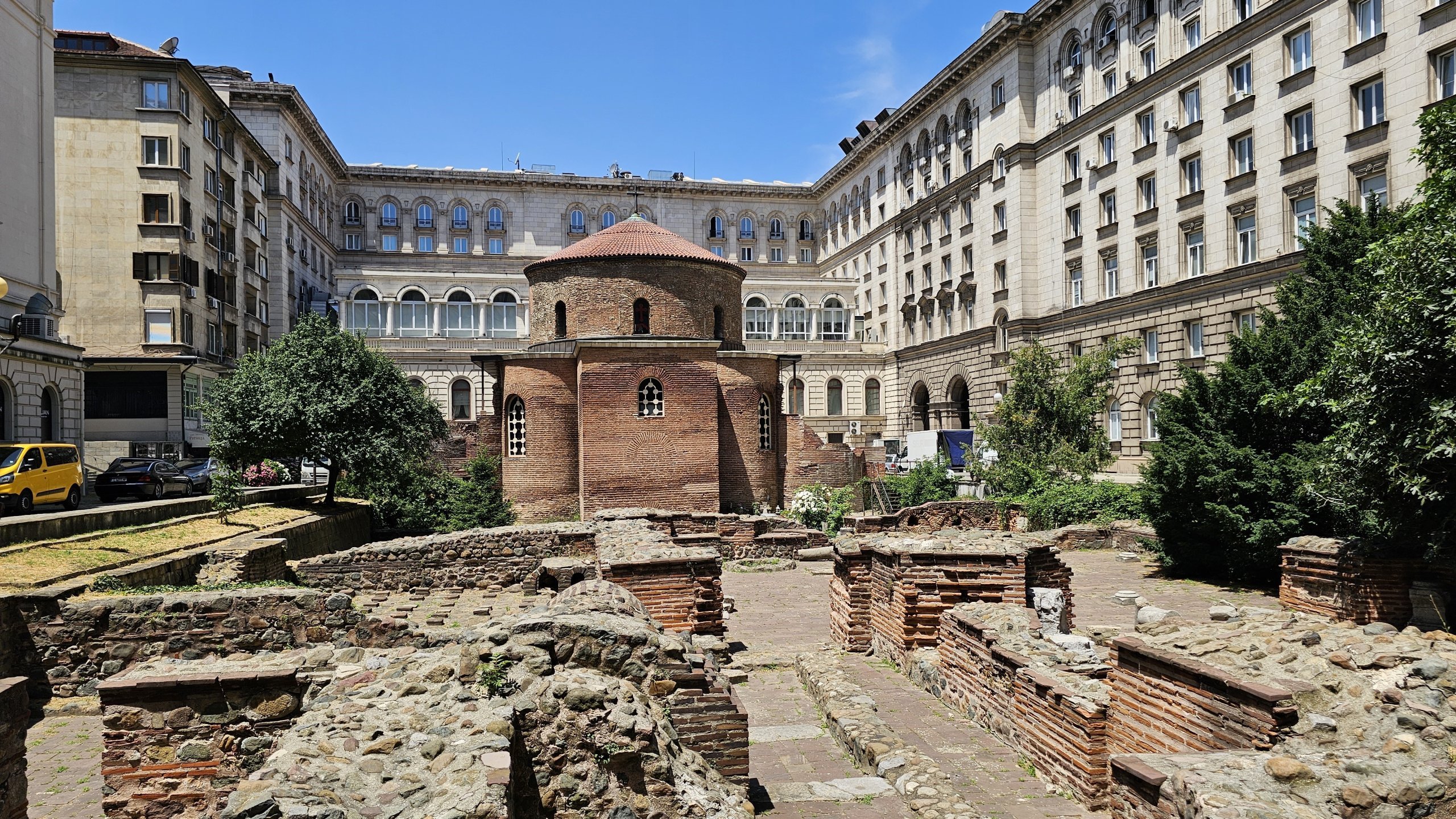 Aziz George'un kırmızı tuğladan inşa edilmiş küçük Romanesk rotundası, çevresindeki sosyalist klasisizm tarzında inşa edilmiş devasa binalarla keskin bir tezat oluşturmaktadır.