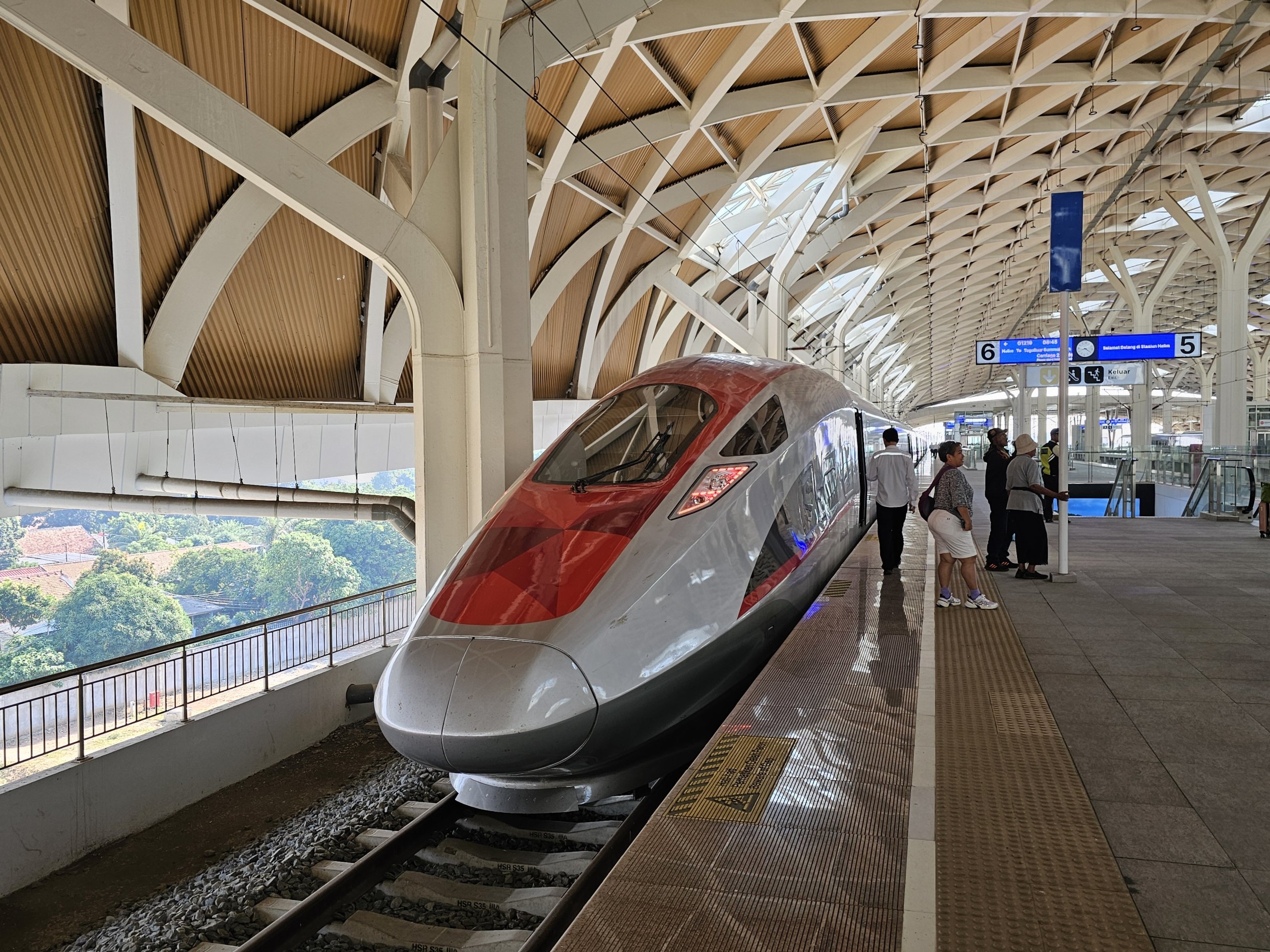 Yüksek hızlı trenler şehir merkezinin yaklaşık 15 km güneydoğusundaki Halim istasyonunda durmakta olup, bu istasyona Dukuh Atas istasyonundan LRT ile yaklaşık 10 000 idr veya Grab / Gojek ile yaklaşık 50 000 idr karşılığında ulaşılabilmektedir.