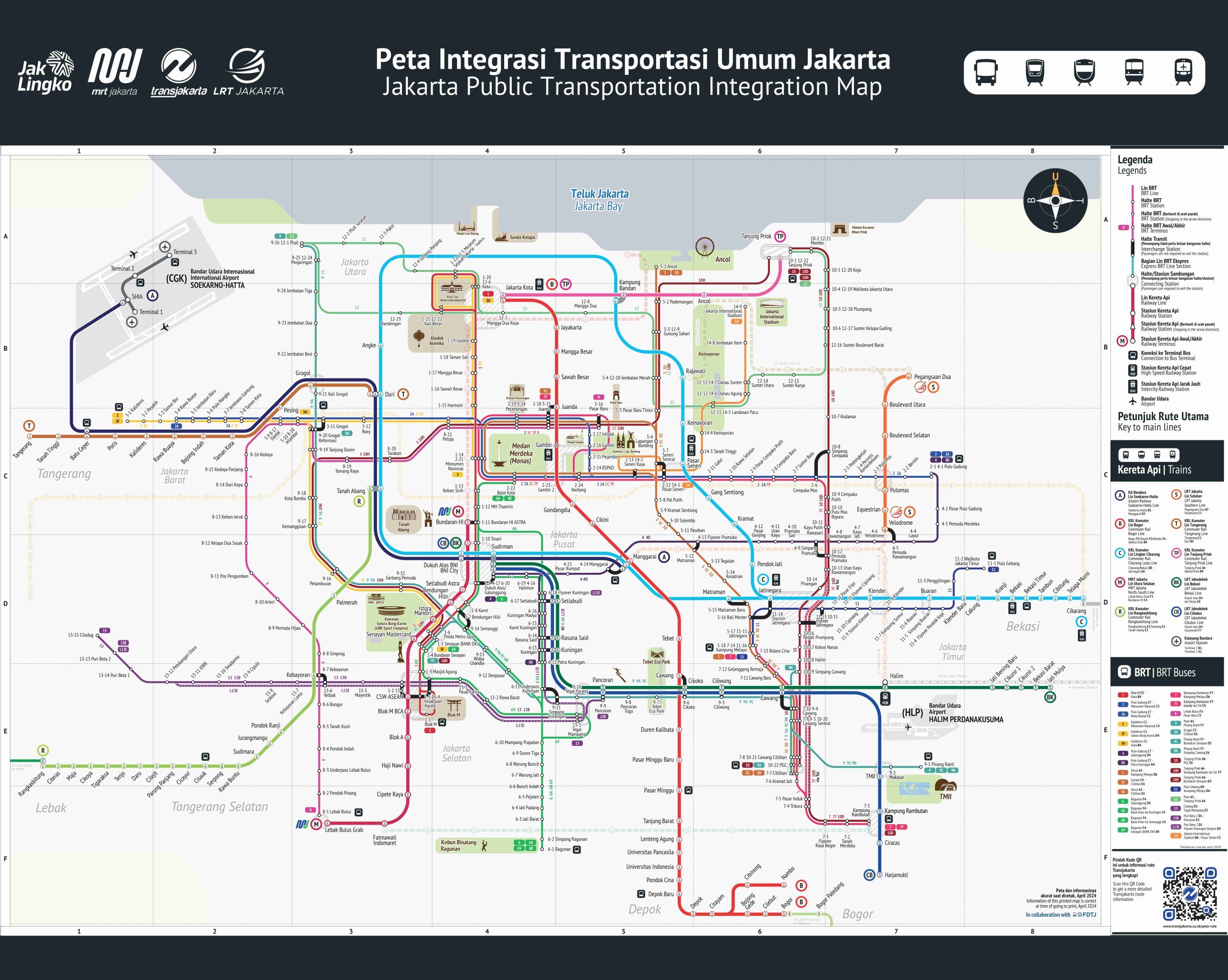 BRT otobüsleri TransJakarta ulaşım haritasında trenler ve metrolarla birlikte gösterilmektedir.