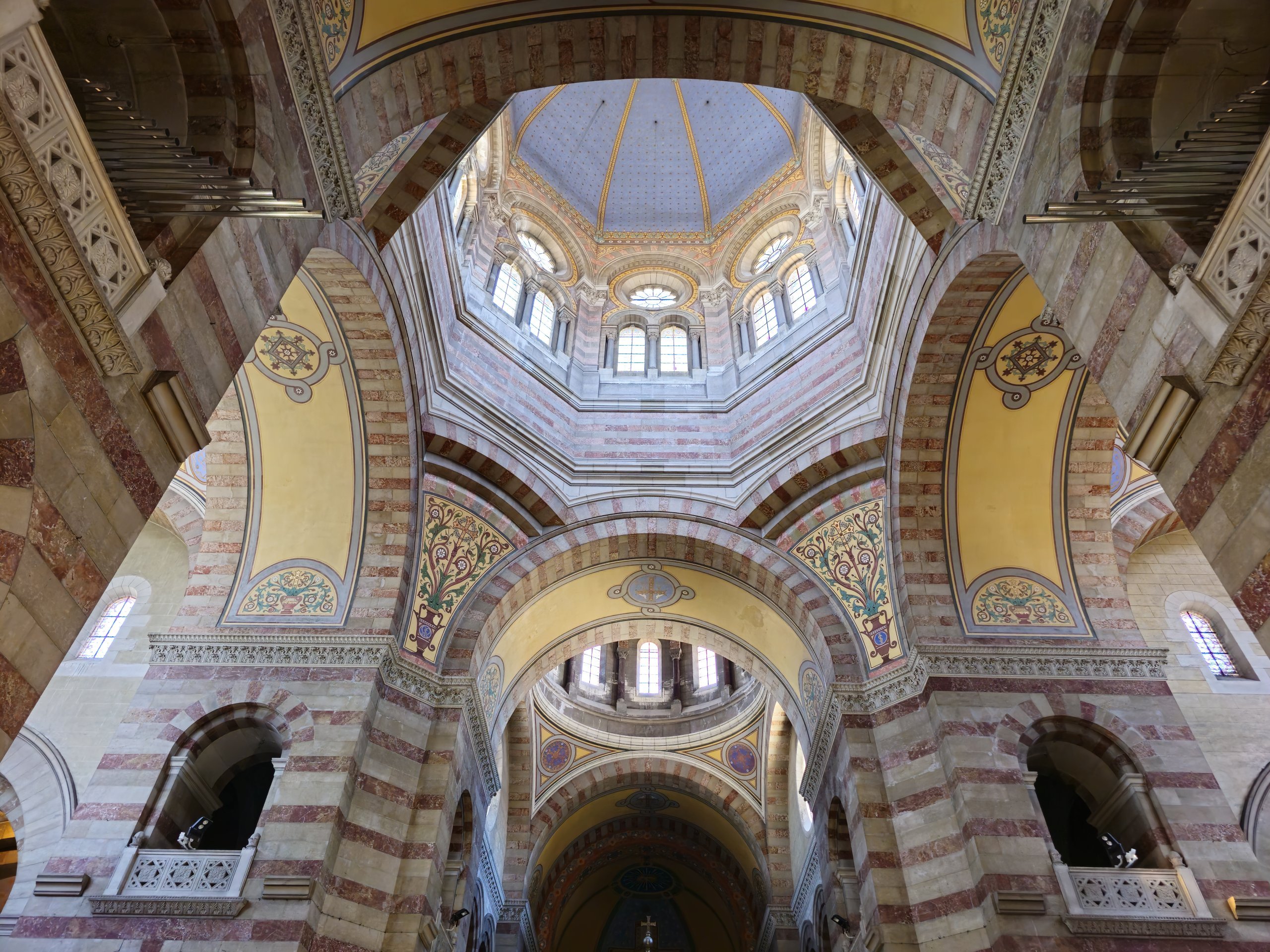 Üç nefli katedralin girişi anıtsal ve güzel bir şekilde dekore edilmiş bir portikodan geçmektedir. Cömert iç mekânlar beyaz Carrara mermeri ve pembe porfir duvarlarla kaplıdır.