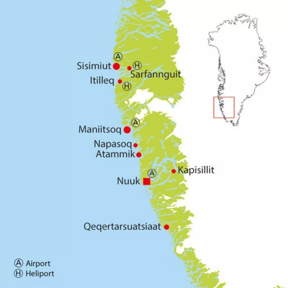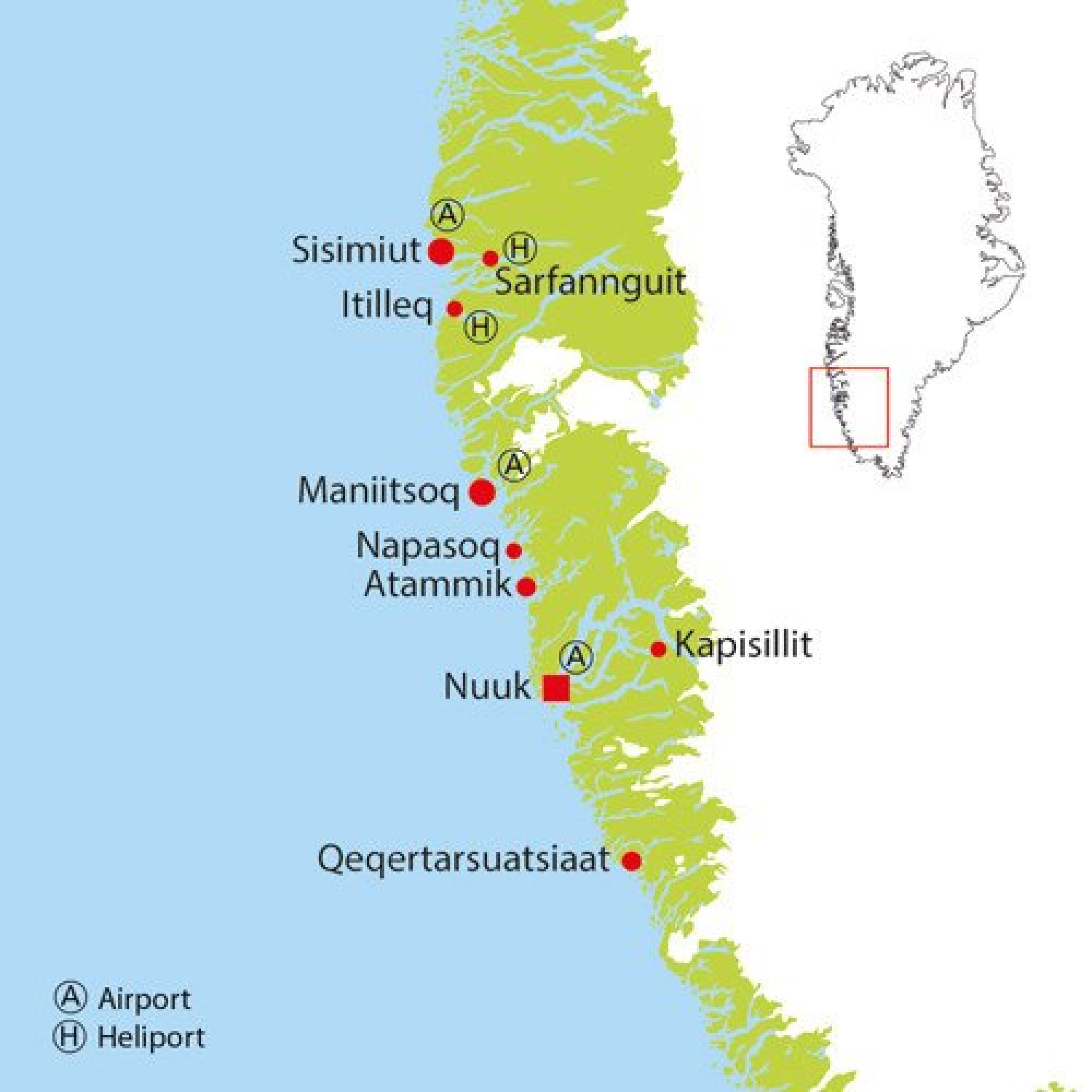 Grönland'ın %90'ından fazlası sürekli bir buz tabakasıdır ve kasaba ya da köyler son derece uzun kıyı şeridi boyunca dağılmış durumdadır.