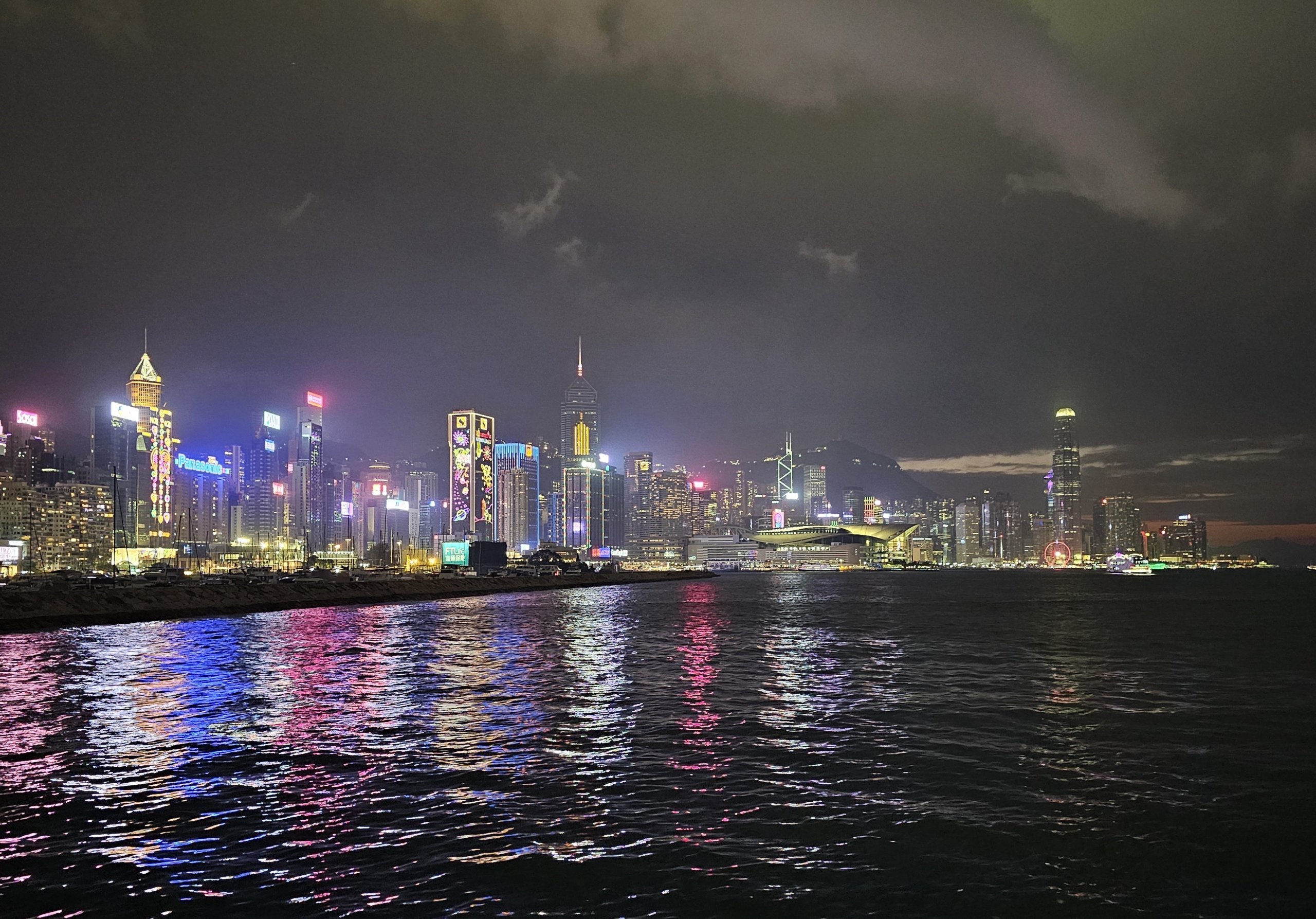 Sol tarafta düzinelerce gökdeleniyle Hong Kong'un merkezinin nefes kesici siluetini görürken, sağ tarafta Kowloon'un yüksek binaları gökyüzüne doğru yükseliyor.