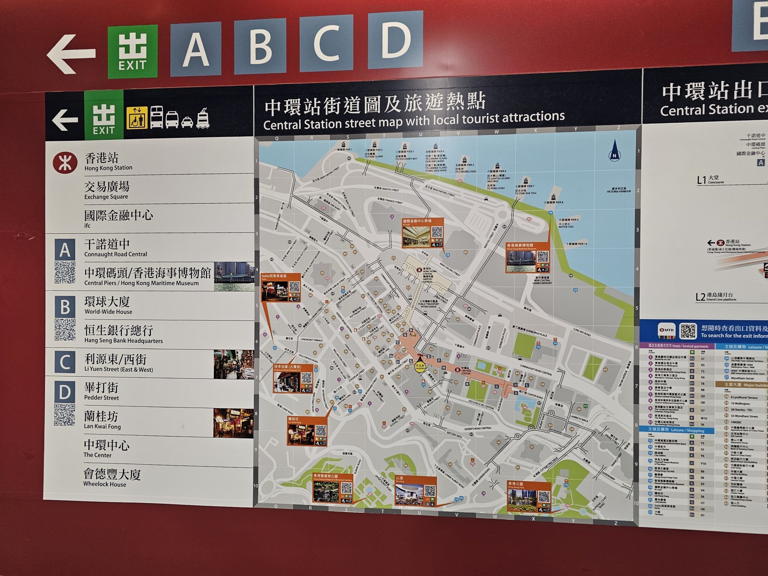 Bölgenin büyük haritaları, çıkışların harflerle işaretlendiği istasyonlara asılmıştır.