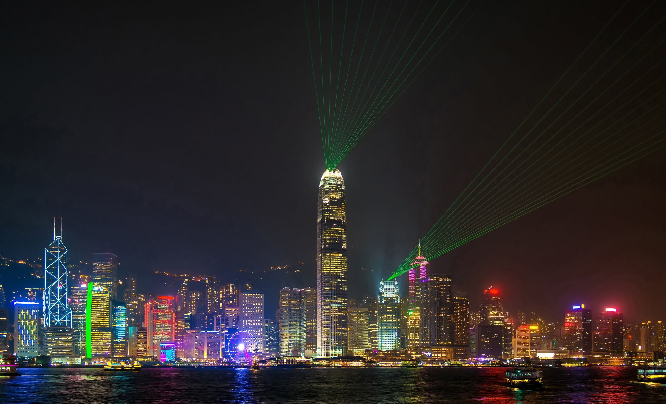 Hong Kong Adası ve Kowloon'daki 43 binanın çatısından lazer ışınları yanar ve müziğin ritmine göre dans eder.