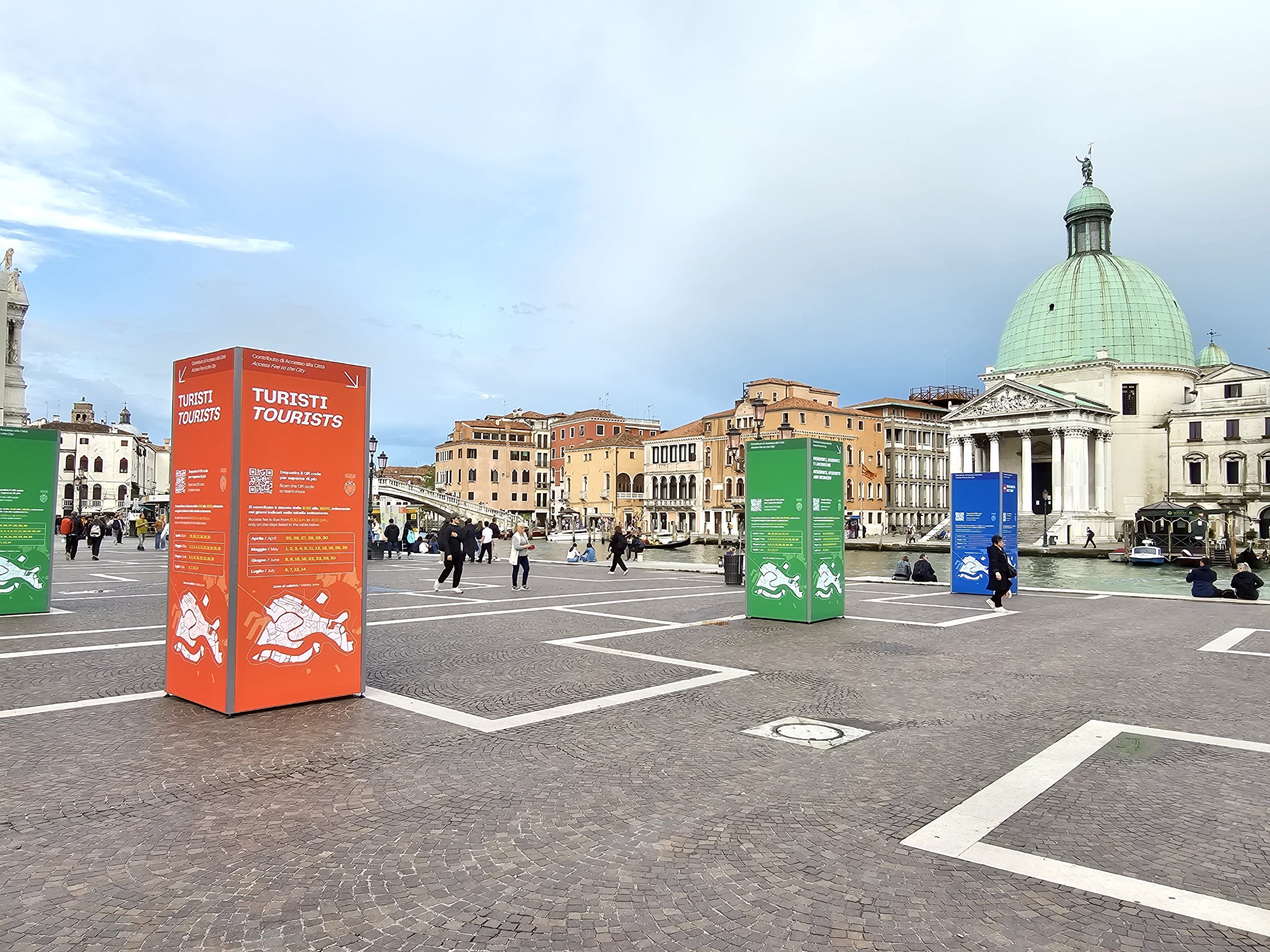 Venedik ödeme bölgesinin tüm girişlerinde, turuncu, sarı veya yeşil yansıtıcı yelek giyen işaretli personel durur ve tüm yeni gelenleri kontrol eder.