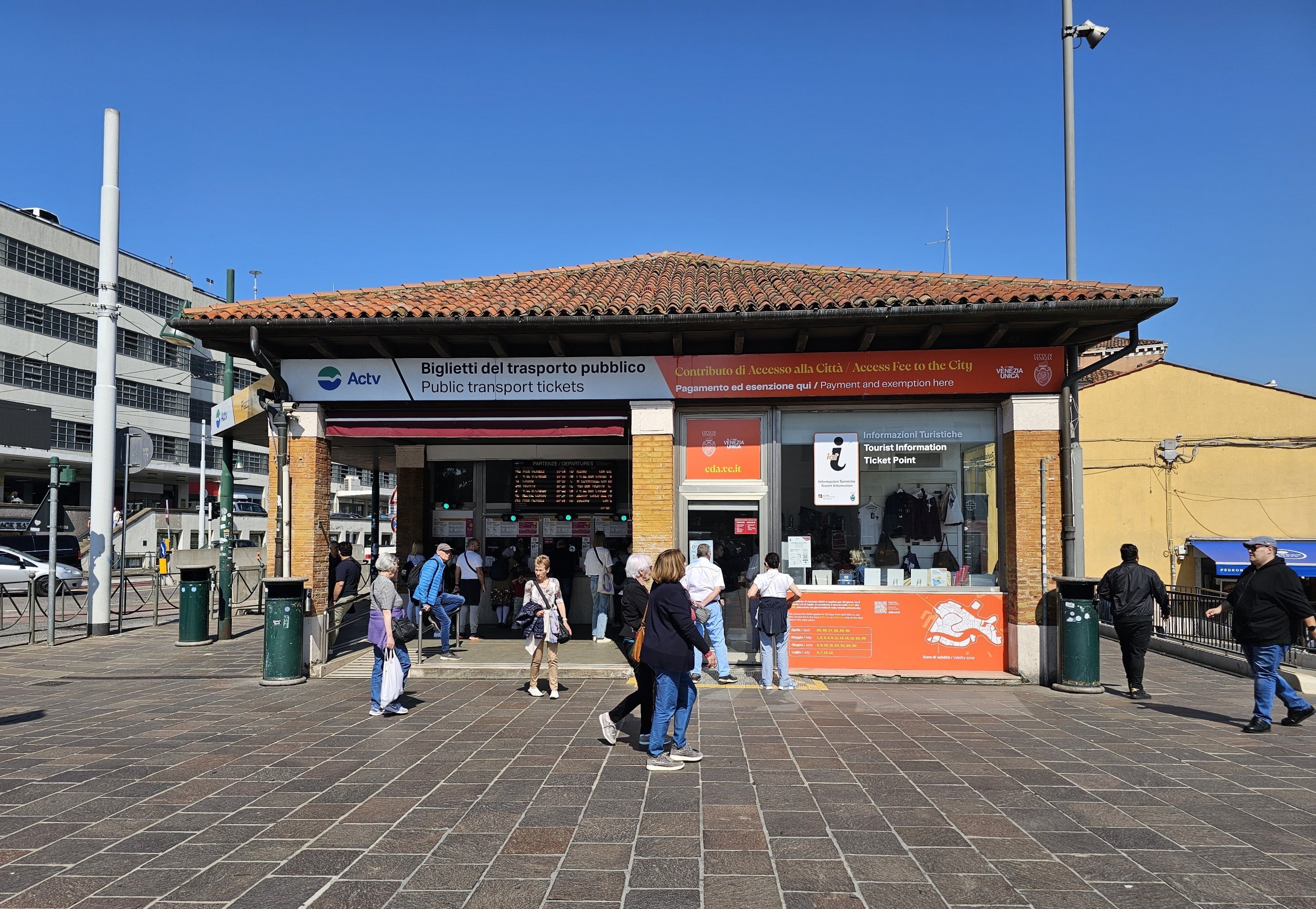 Piazzale Roma çevresi, Santa Lucia tren istasyonu, Tronchetto otobüs terminali ve otoparkı ile Tronchetto büyük yolcu gemisi iskelesi giriş ücretinin dışındadır.
