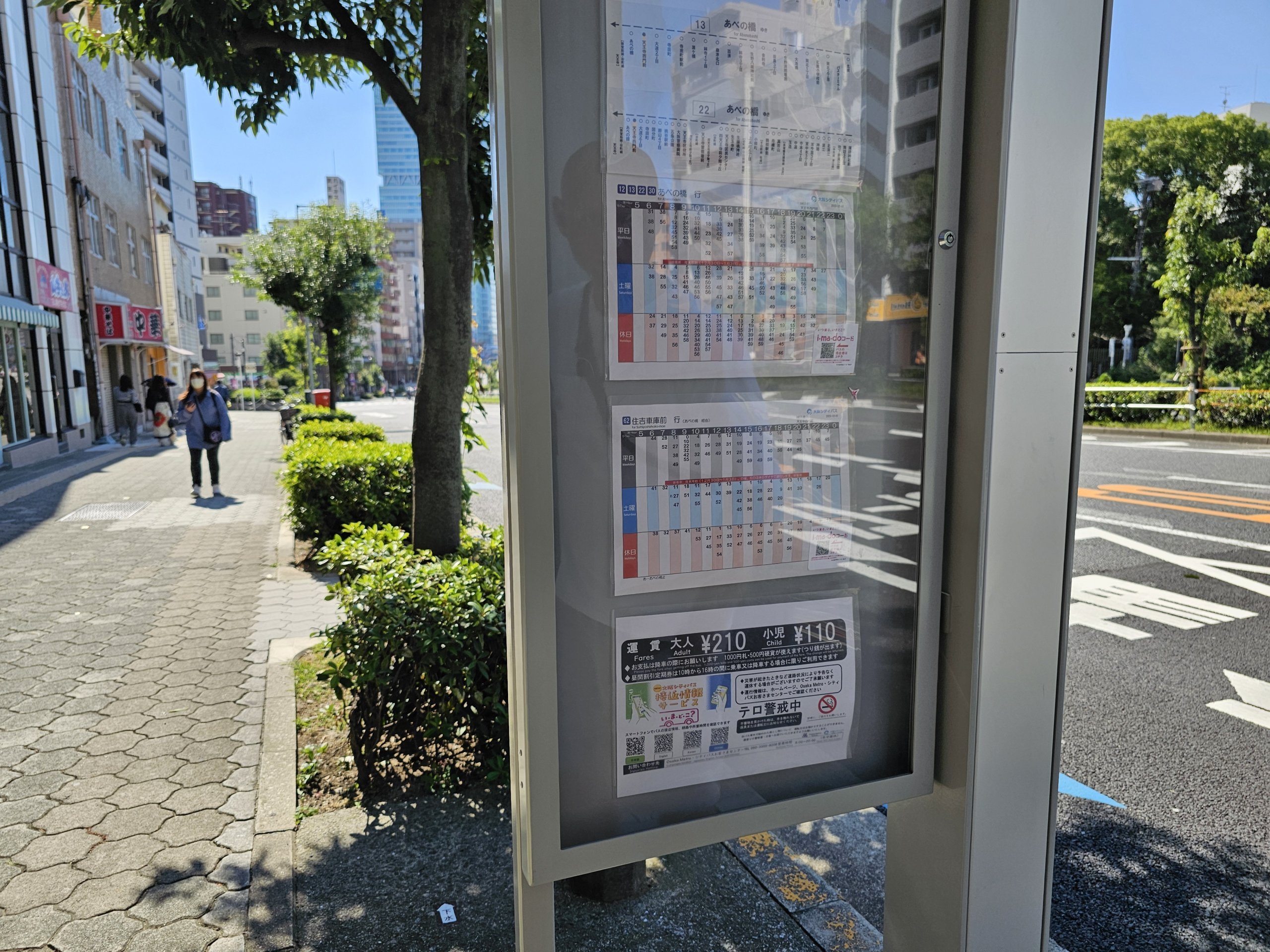 Otobüs güzergahlarının tam bir haritasını şu adreste bulabilirsiniz: bus.osakametro.co.jp/routemap. Otobüsler normalde sabah 5:30'dan gece yarısına kadar çalışmaktadır ve her hattaki sefer sıklığı genellikle 20-30 dakikadır.