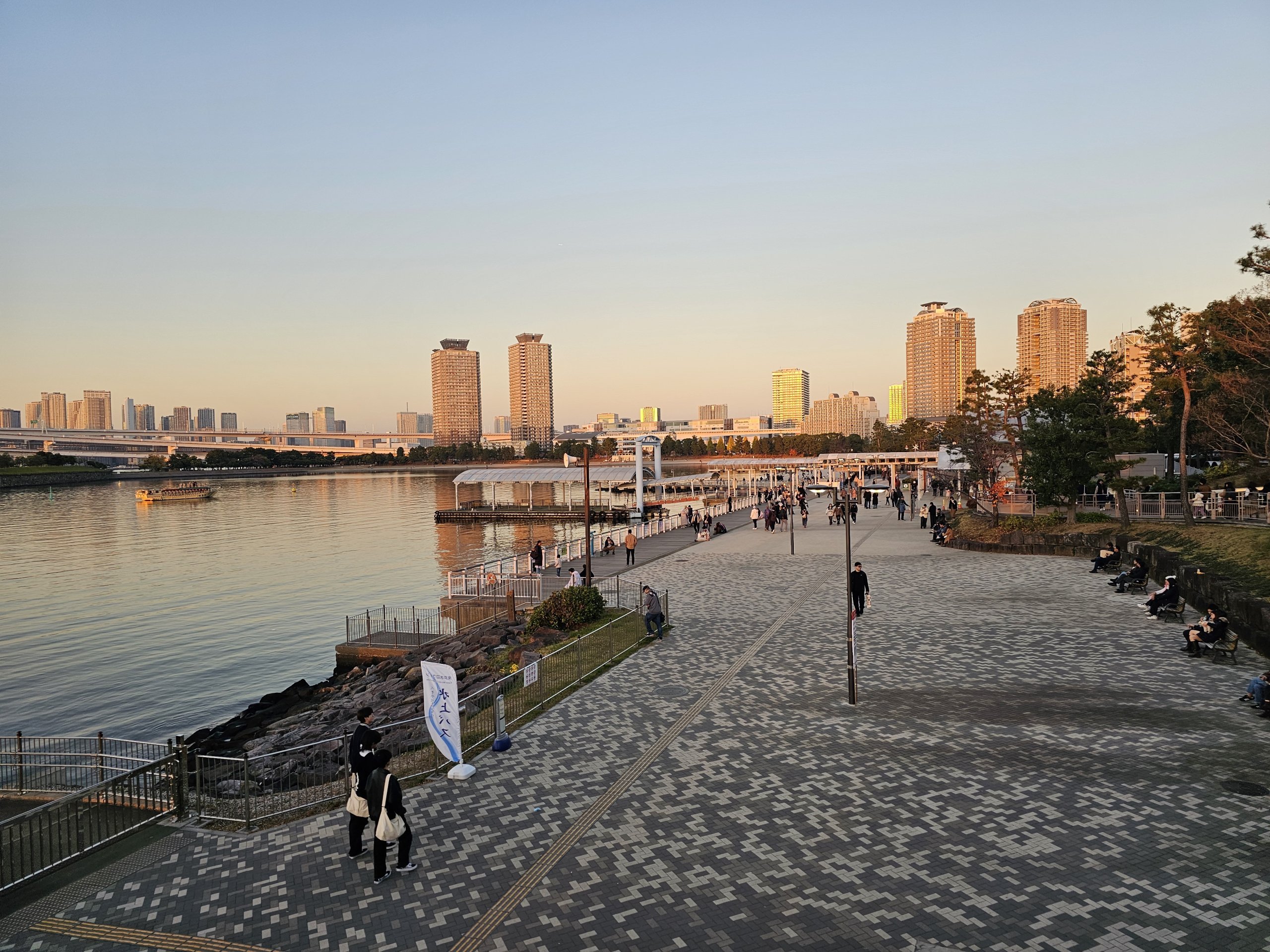 Odaiba Özgürlük Heykeli, Tokyo Körfezi ve Gökkuşağı Köprüsü manzaralı, yiyecek tezgâhlarıyla dolu popüler bir yaya gezinti yolu üzerinde yer almaktadır.