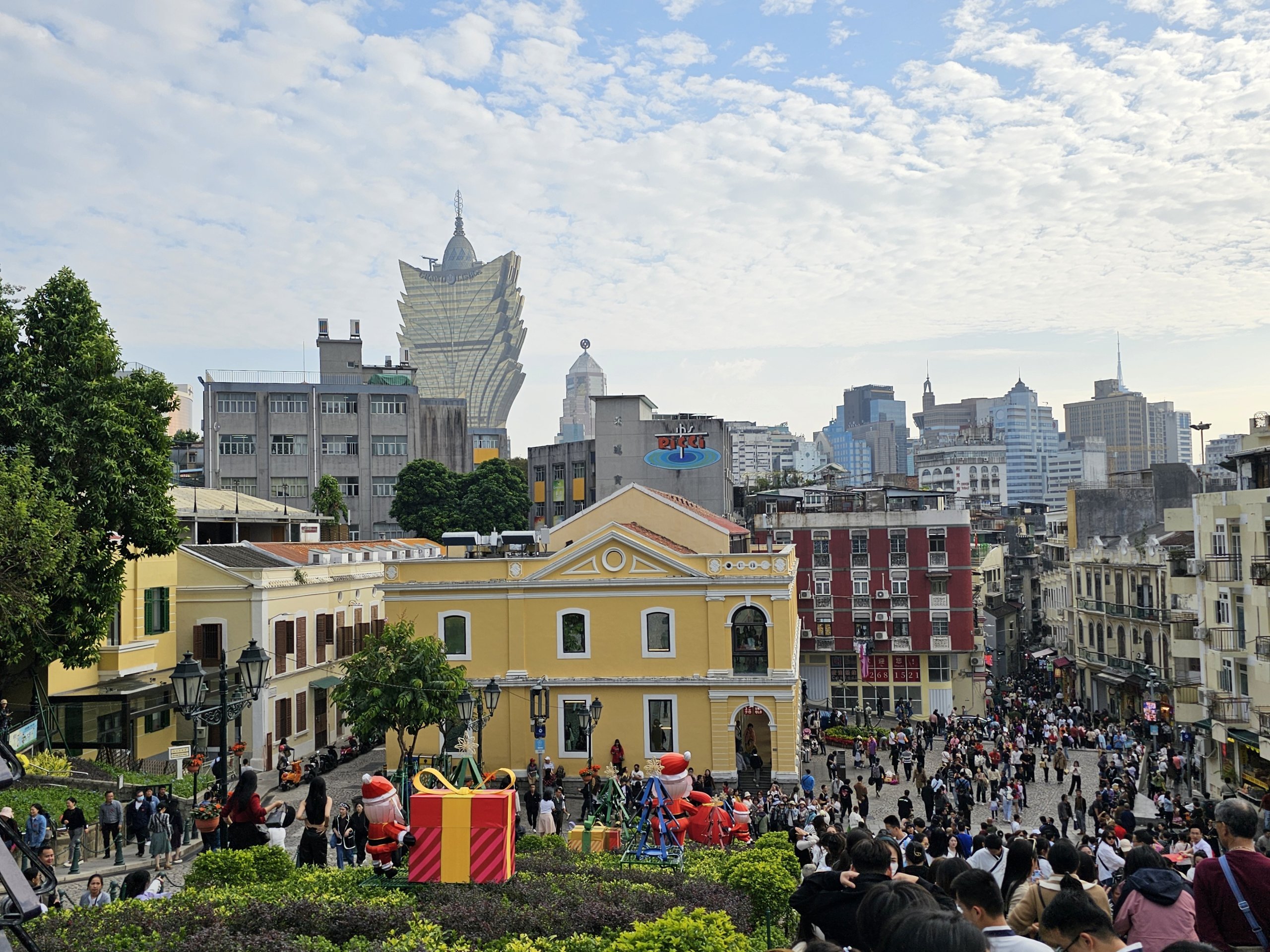 Meydan, arka plandaki cepheyle selfie çekmek isteyen turist kalabalığıyla Makao'da en çok ziyaret edilen yerdir.