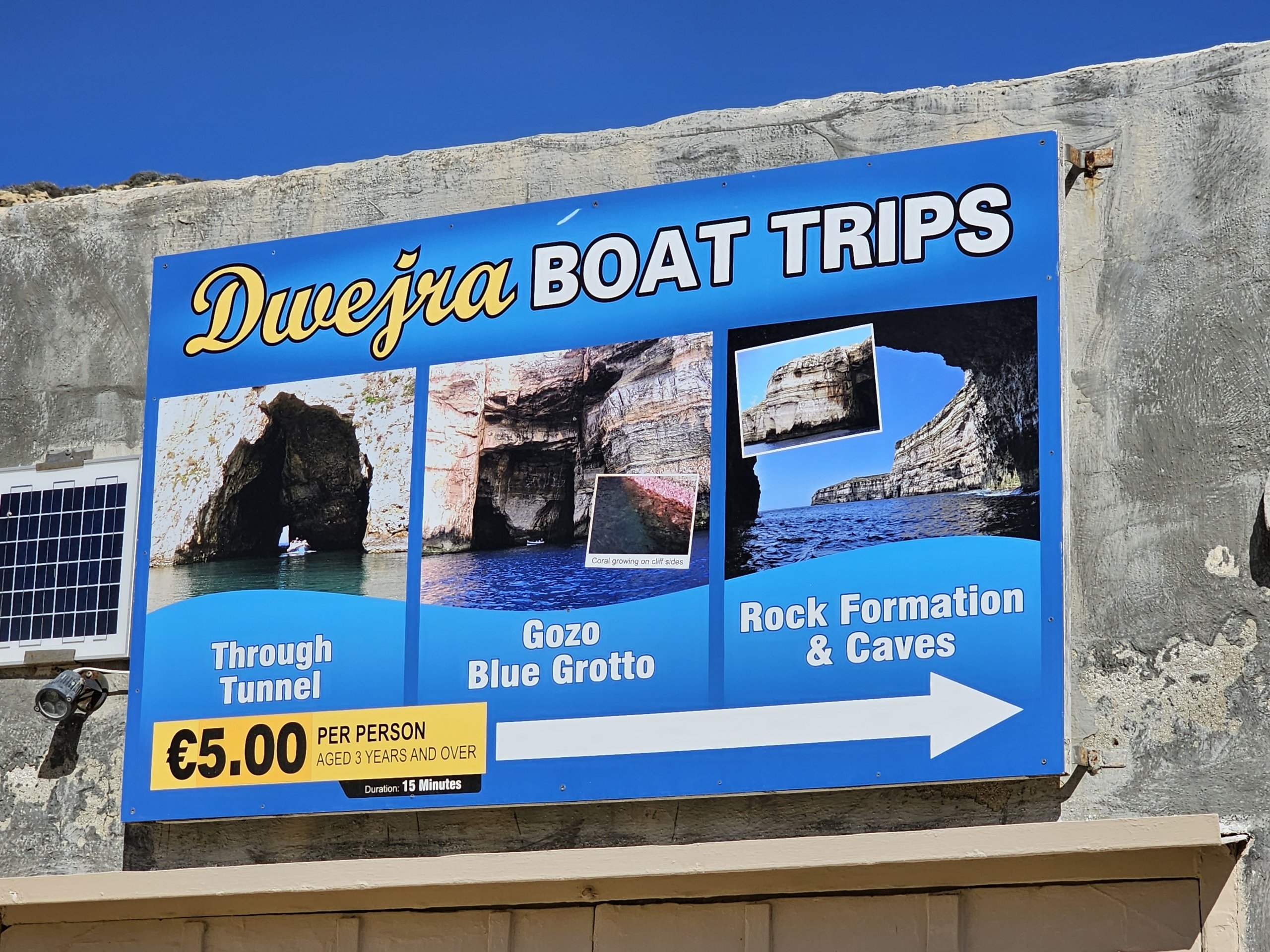 5 avronun ötesinde, bir tünelden geçerek açık denize doğru yaklaşık 15 dakikalık bir tekne yolculuğunun keyfini çıkarabilirsiniz. Ayrıca Azure Penceresi'nin bulunduğu yeri de görebileceksiniz.