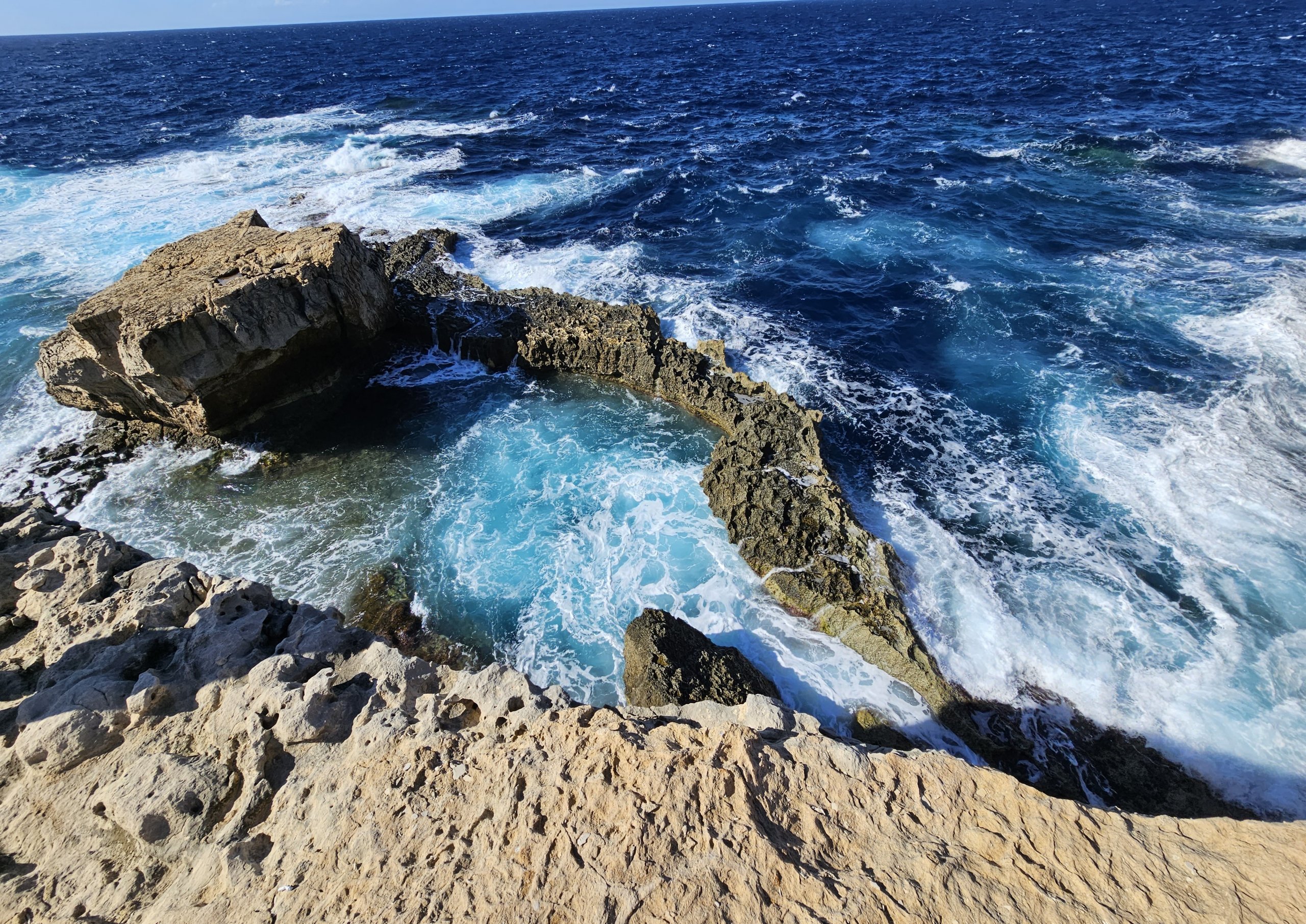 Çökmüş Azure Penceresi'nin bakış açısından, kıyıdan hemen açıkta doğal bir deniz havuzu oluşturan eşsiz bir kaya oluşumunun manzarasını göreceksiniz.