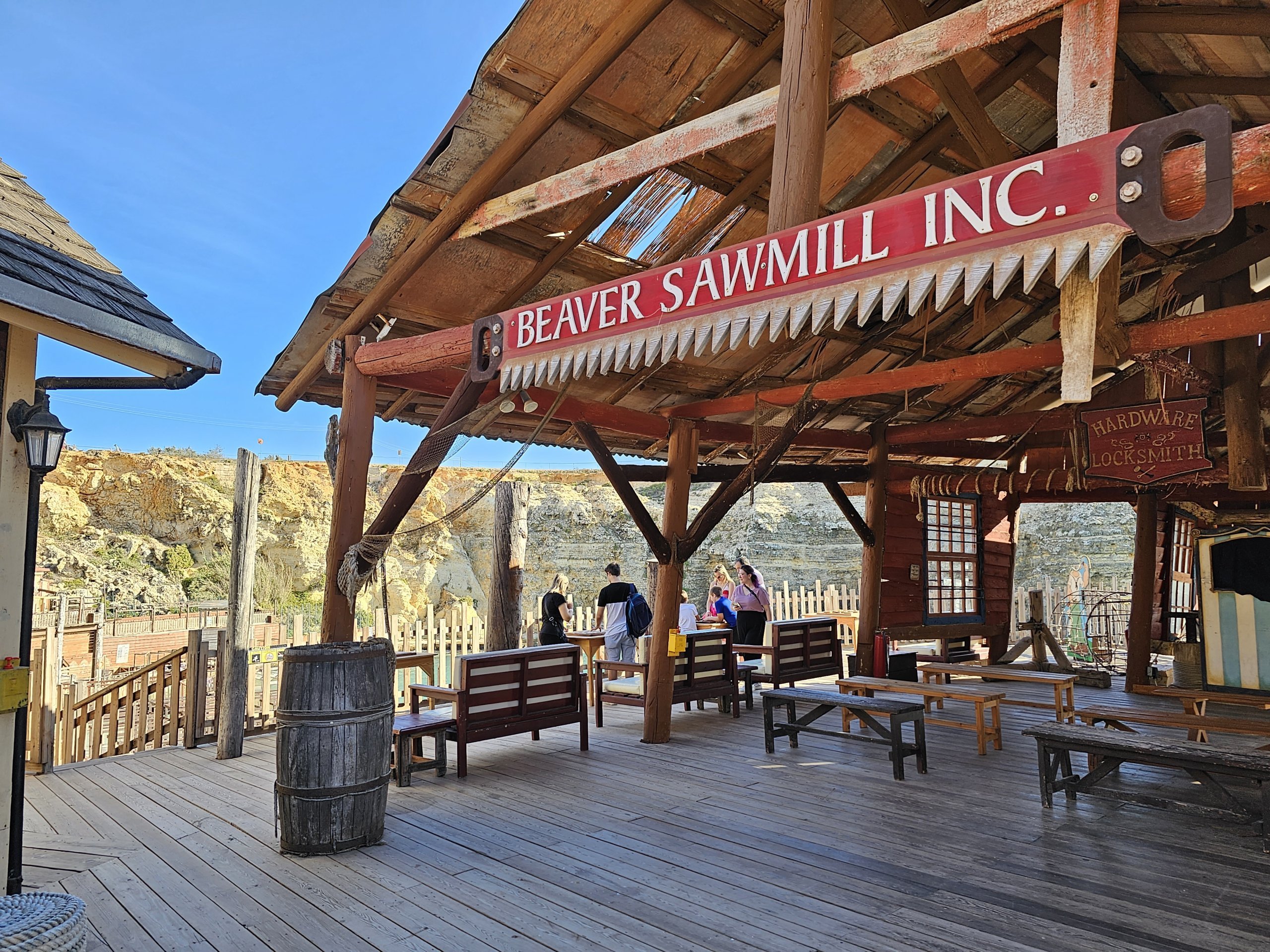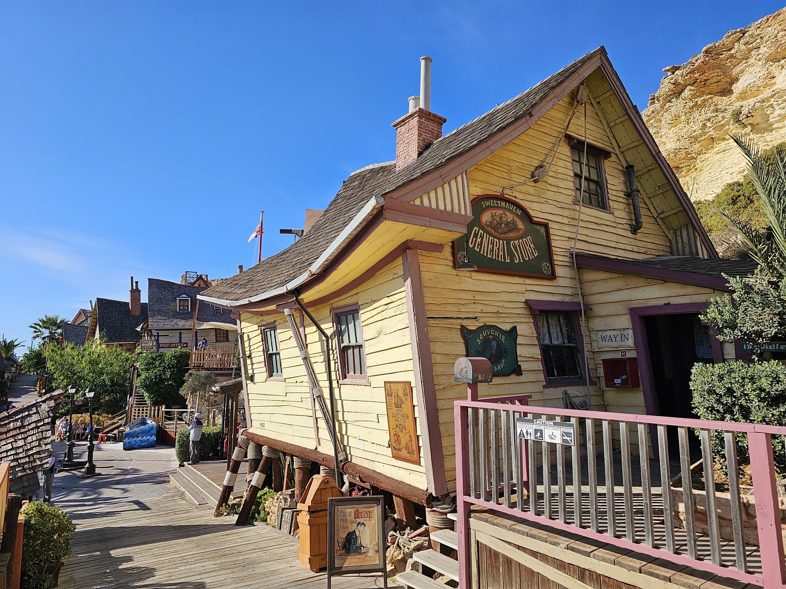 Film sahnesi hediyelik eşya dükkanları, restoranlar, barlar ve "Popeye the Sailor" filminden kesitler gösteren bir sinema ile tamamlanmaktadır.