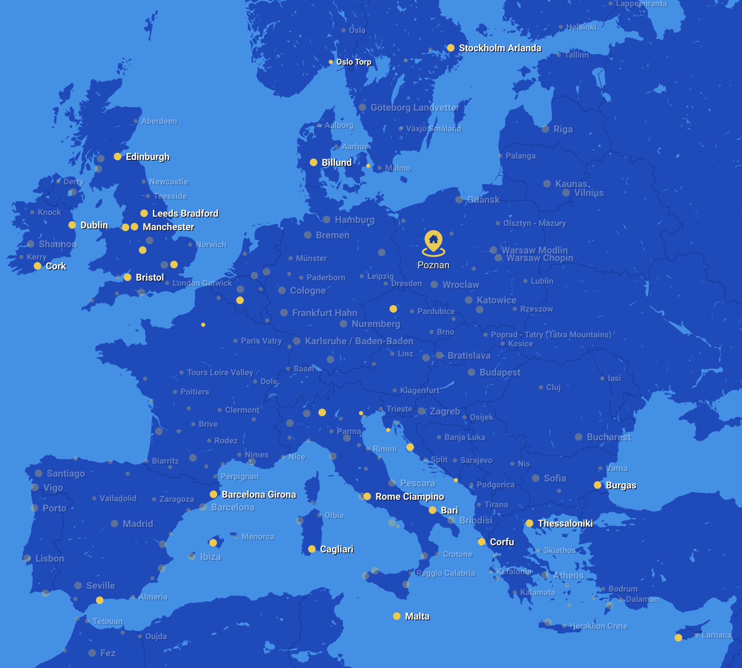 Poznan'a uçan diğer havayolları arasında Lufthansa, LOT, KLM, Pegasus, Wizz Air ve flyDubai bulunmaktadır.