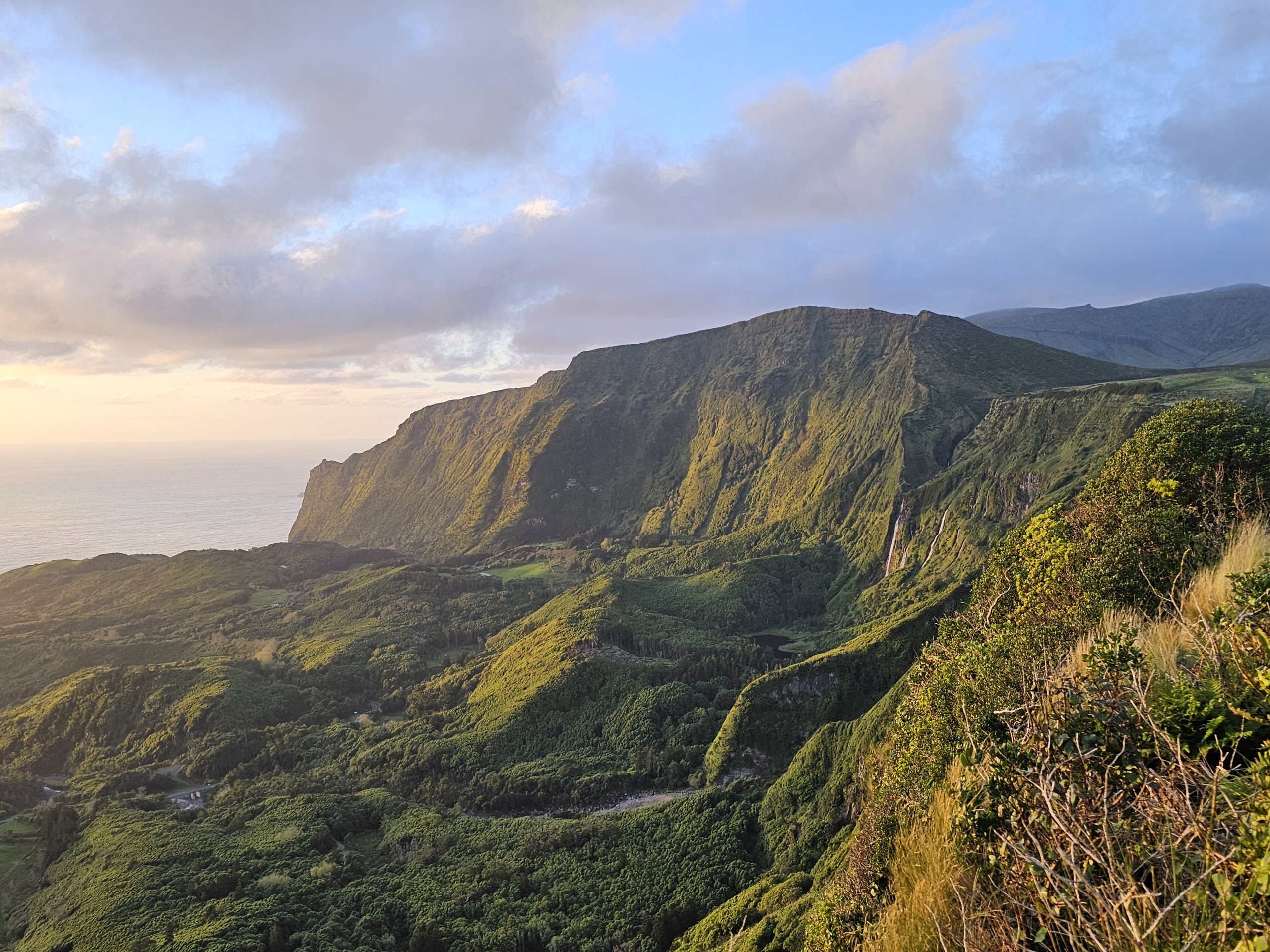 Fajãzinha köyü ve geniş Atlantik Okyanusu'nun bulunduğu vadi, sabah ve öğleden sonra güneş tarafından güzel bir şekilde aydınlatılmaktadır.