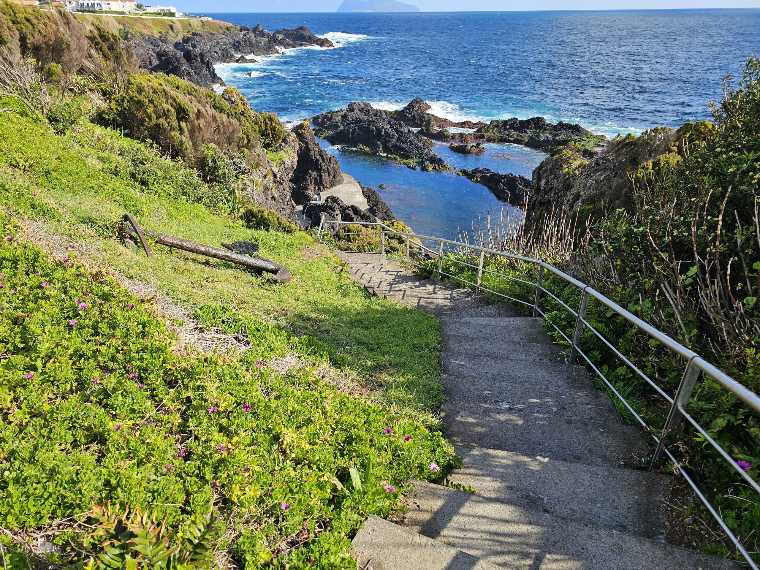 Buradaki deniz, kurumuş lavların oluşturduğu kayalıklarda, beton merdivenler ve duvarlar aracılığıyla yapay erişim sağlanan doğal sakin su havuzları oluşturmaktadır.
