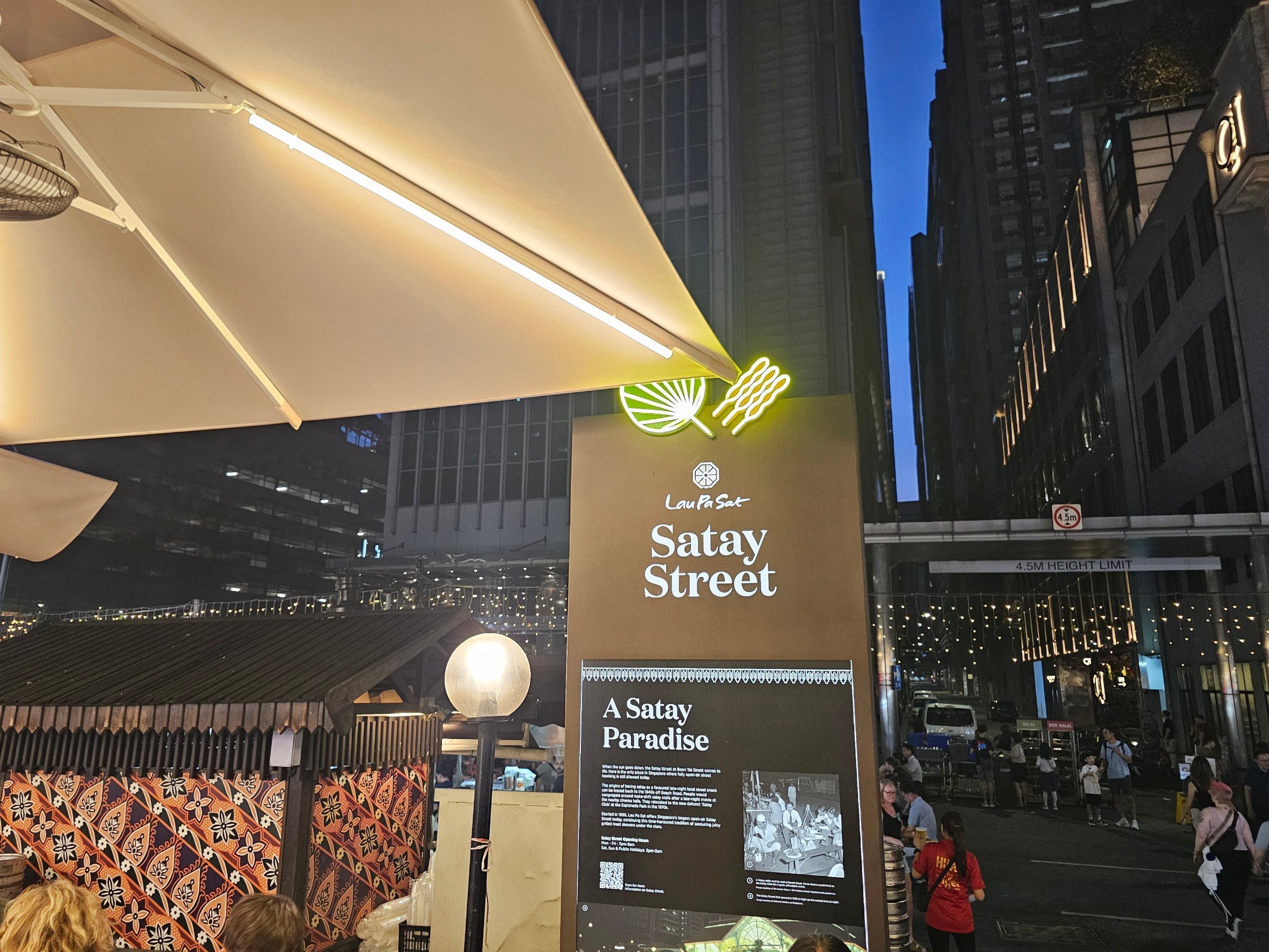 Gün boyunca Lau Pa Sat daha çok ofis çalışanları için sıradan bir kantin. Asıl atmosfer akşam Satay Sokağı açıldığında ortaya çıkıyor.