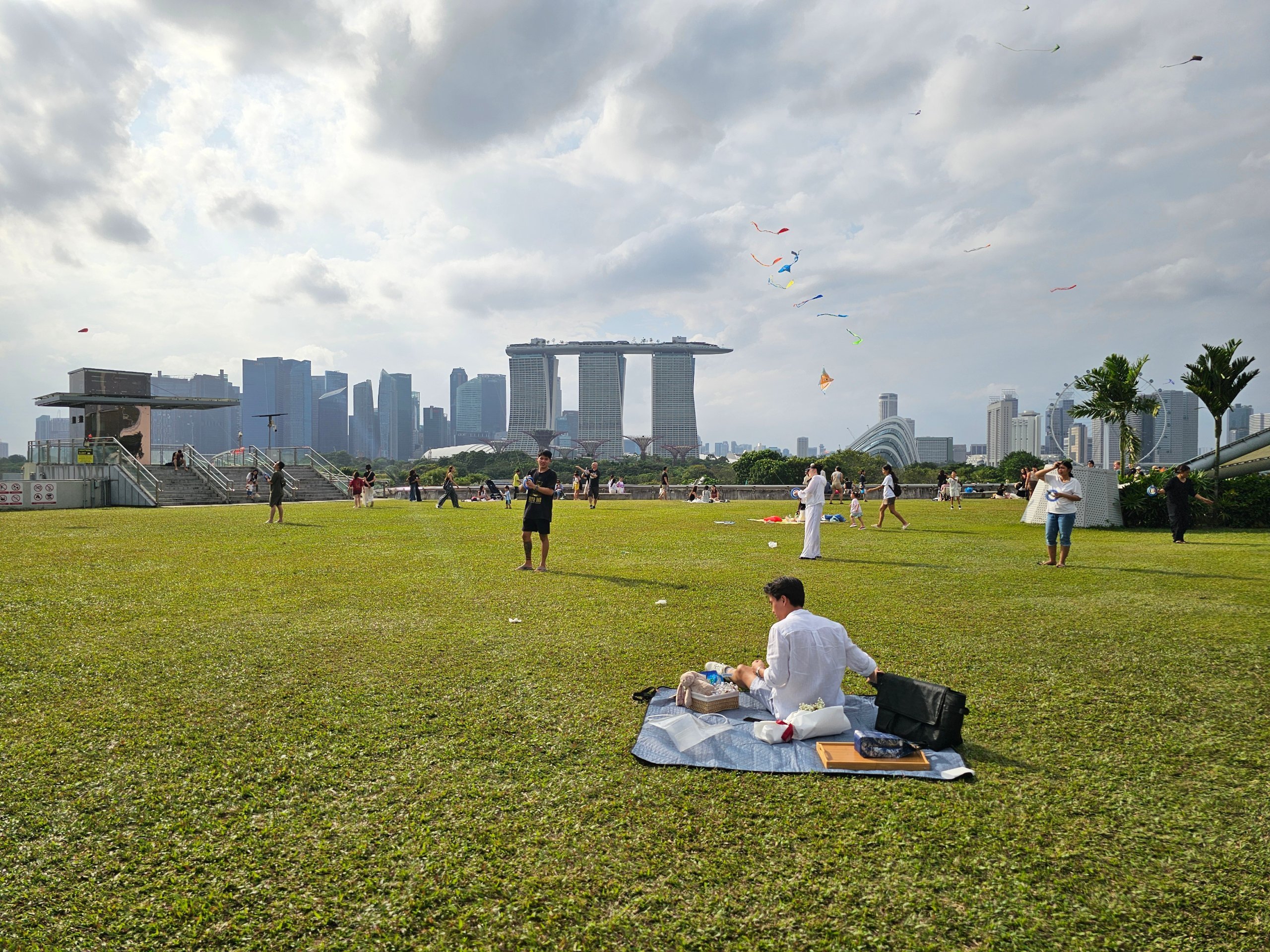 Barajın çatısında, Marina Bay Sands ve Gardens by the Bay de dahil olmak üzere tüm Marina Bay silüetini görebileceğiniz geniş bir çimenlik alan.