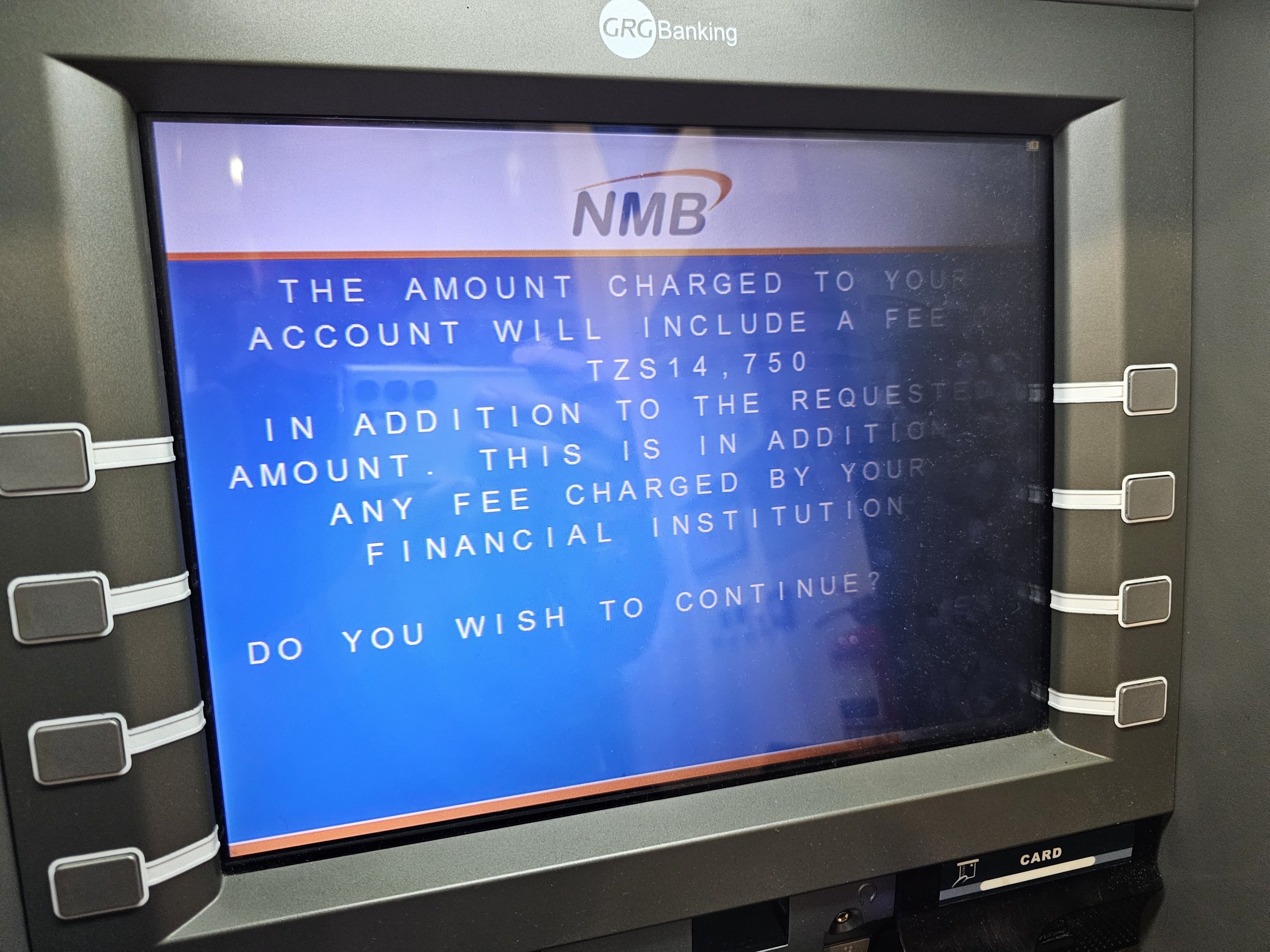 Genellikle yabancı kartlarla yapılan para çekme işlemleri 15 000 tzs civarında ücretlendirilmektedir. Bir Bank of Zanzibar ATM'sinde karşılaştığımız en düşük ücret 10 000 tzs idi.