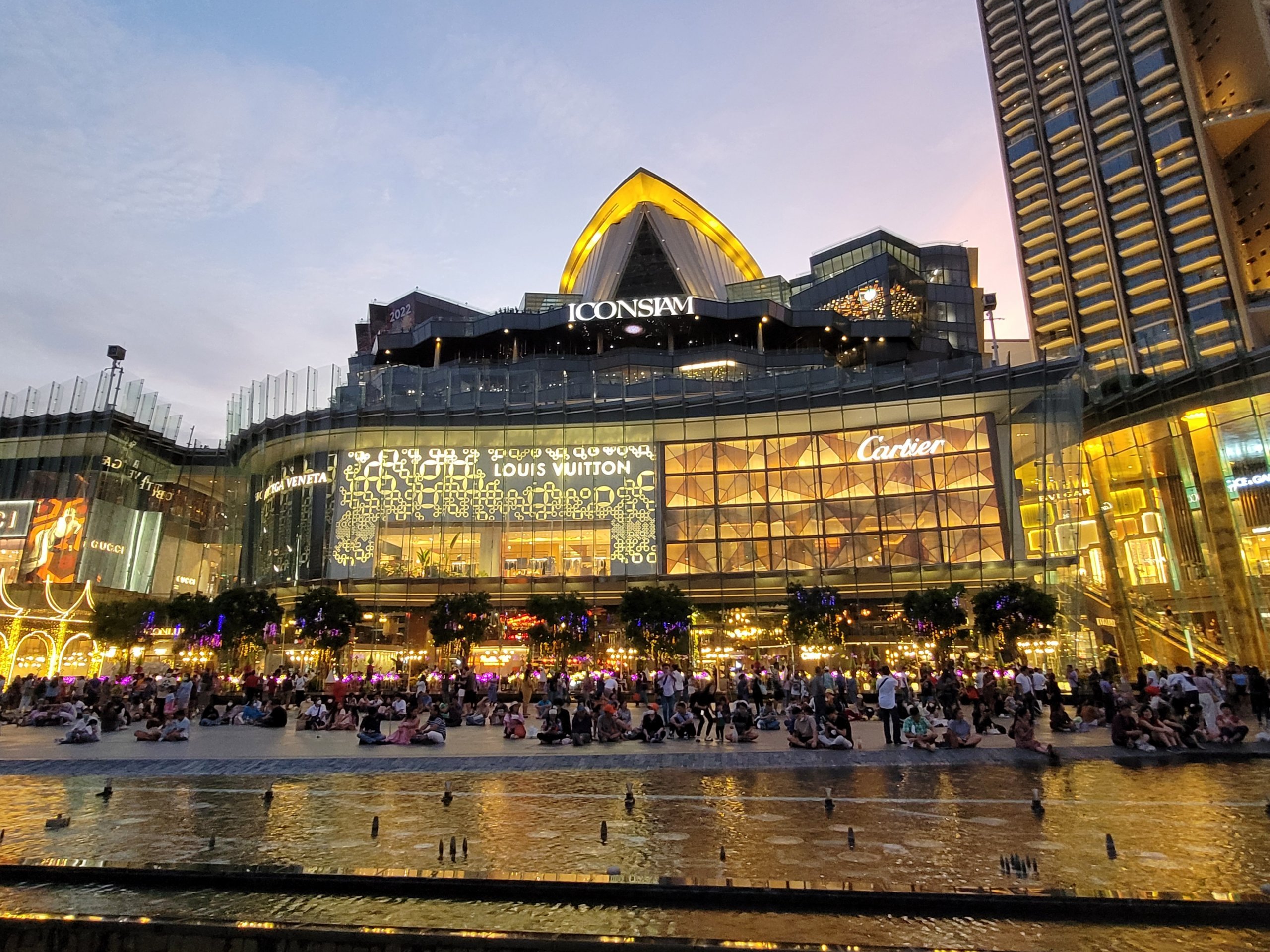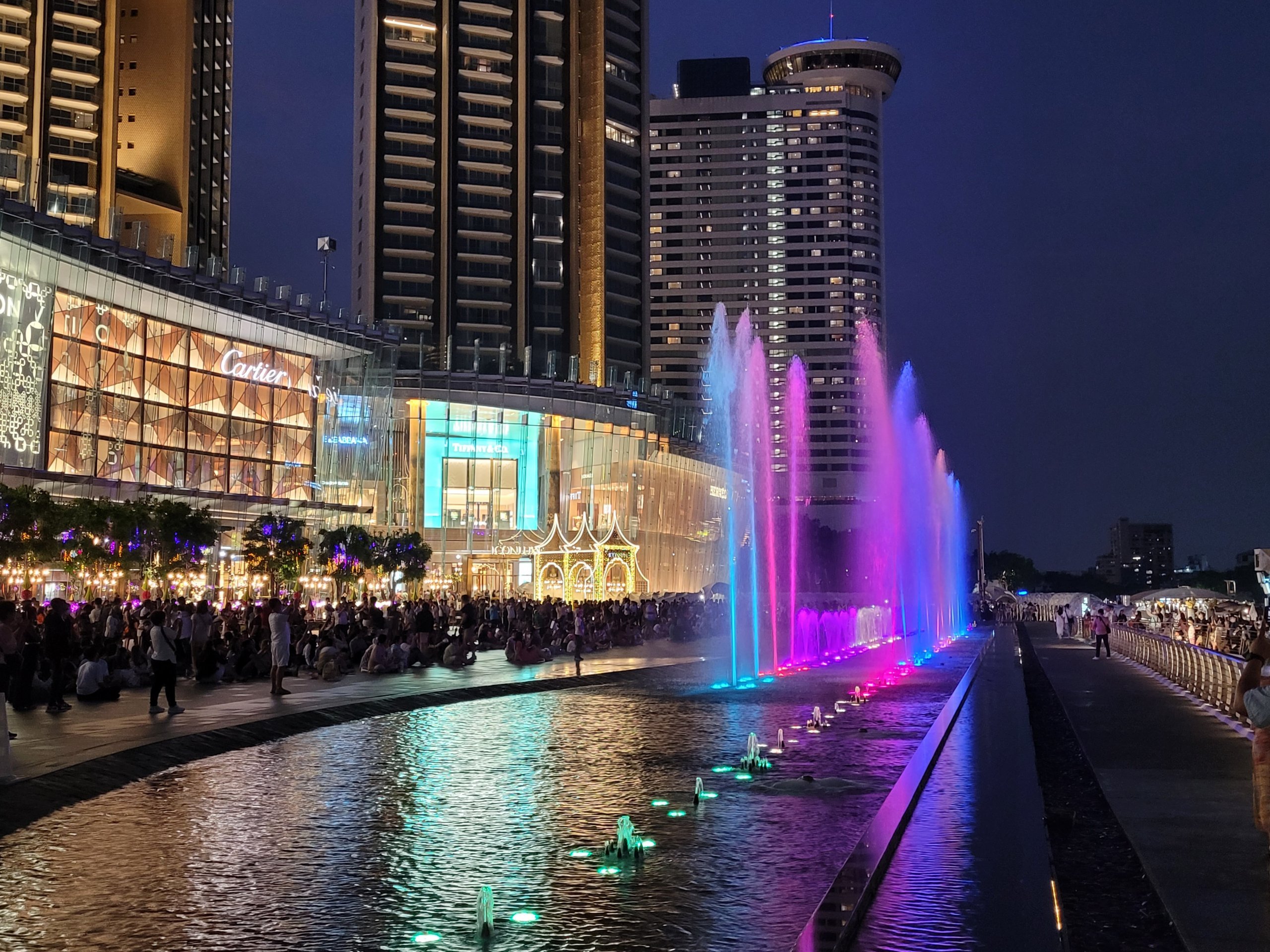 Lüks ICONSIAM alışveriş merkezi sadece alışveriş için ziyaret edilmeye değer değildir. Her akşam, alışveriş merkezi ile nehir arasındaki alanda, yerden fışkıran uzun bir yerel çeşme ile muhteşem bir renk ve müzik gösterisi gerçekleşmektedir.