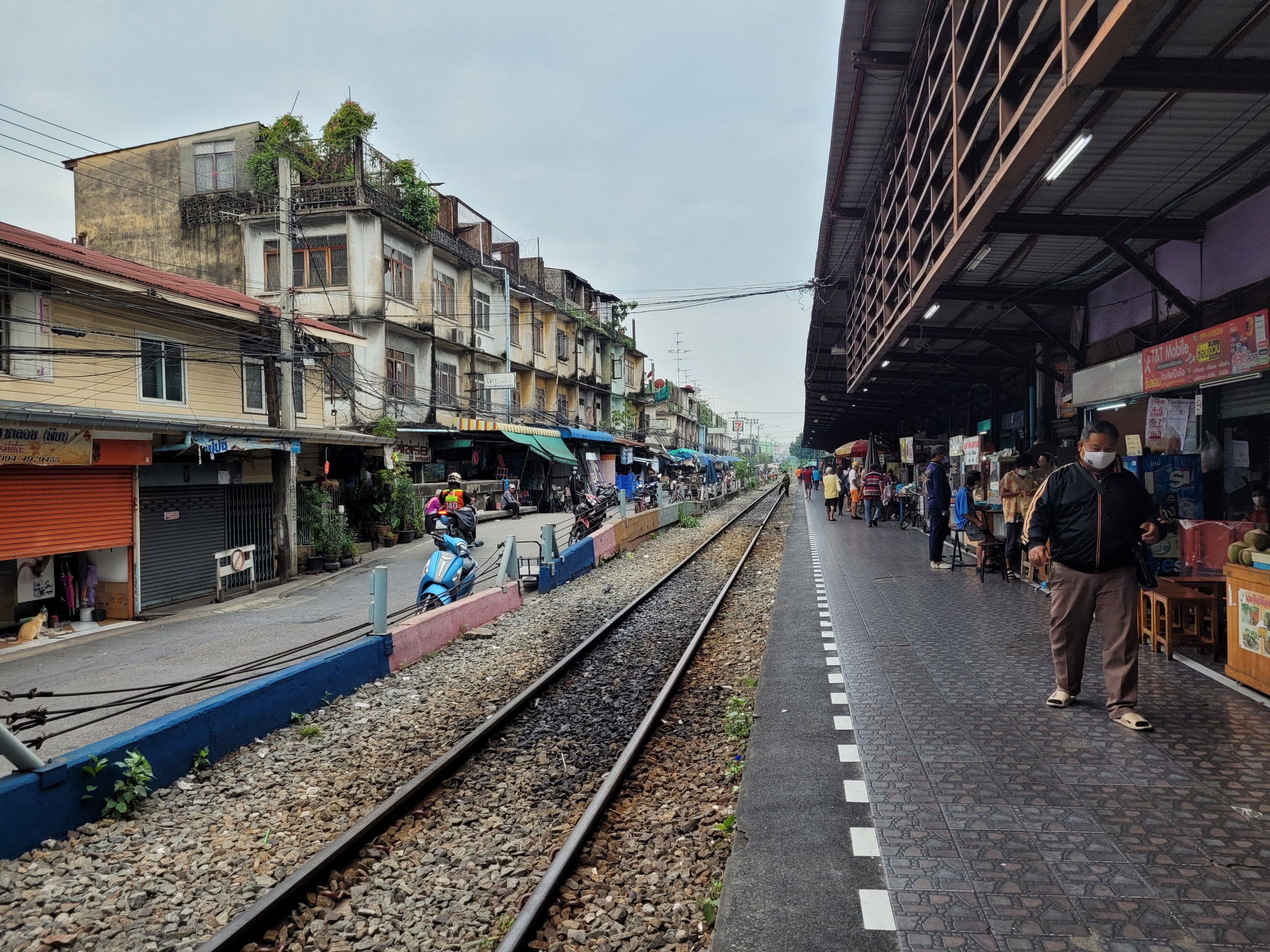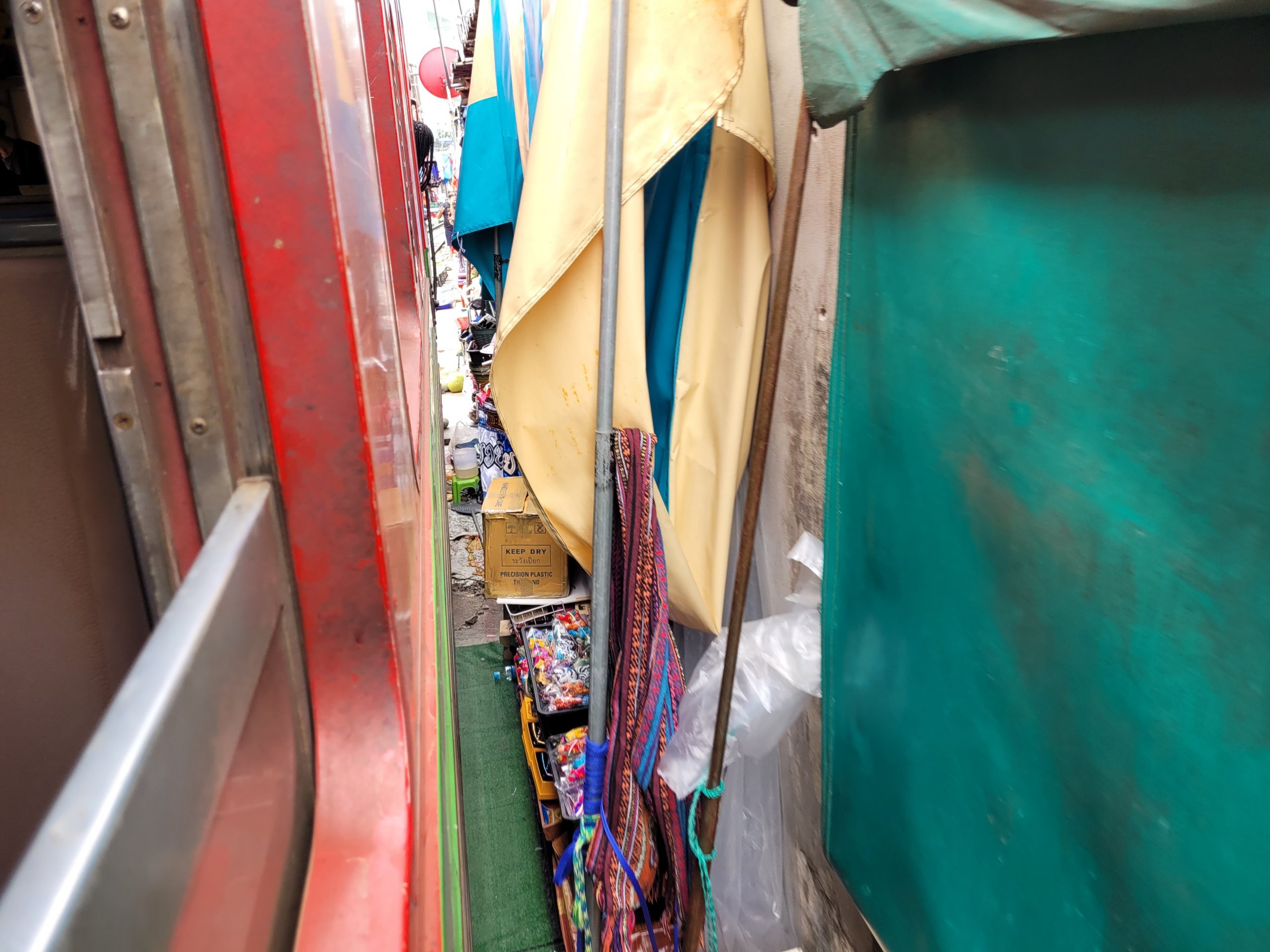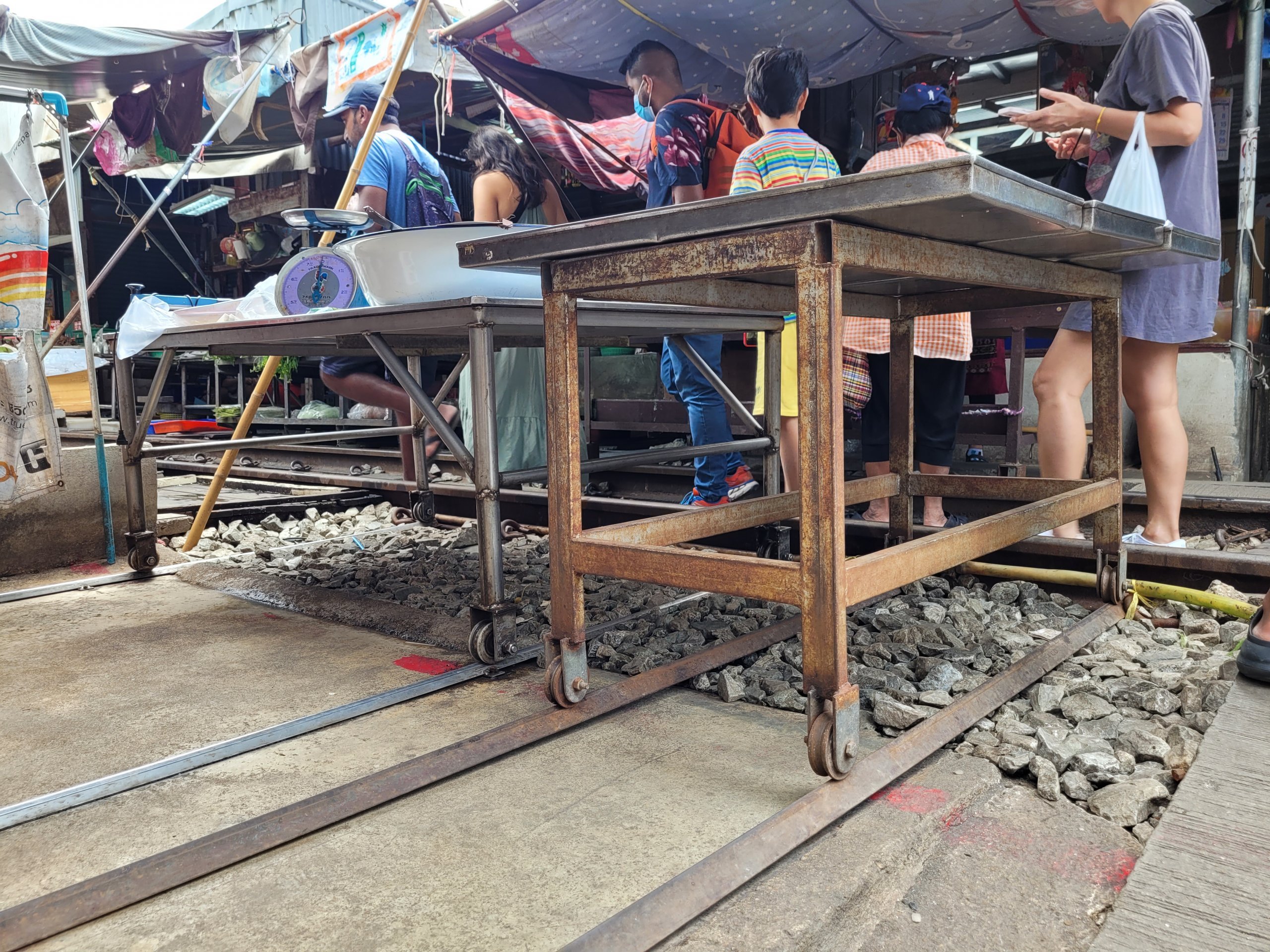 Tayland şehirlerinde alan genellikle bir sorun olduğundan, pazar bir şekilde kendiliğinden Ban Laem kasabasına giden nispeten az kullanılan yerel bir yolda ortaya çıkmıştır. Ne zaman bir tren yaklaşsa, pazar satıcıları tezgâhlarını vagonların ulaşamayacağı bir yere taşıyor ve alışveriş yapanlar da trenin altında kalmamak için kırmızı işaretli çizginin arkasına geçiyor. Tren geçtikten sonra, geçişler arasında sadece 20 dakika olsa bile tezgahlar tekrar yerine konuyor.