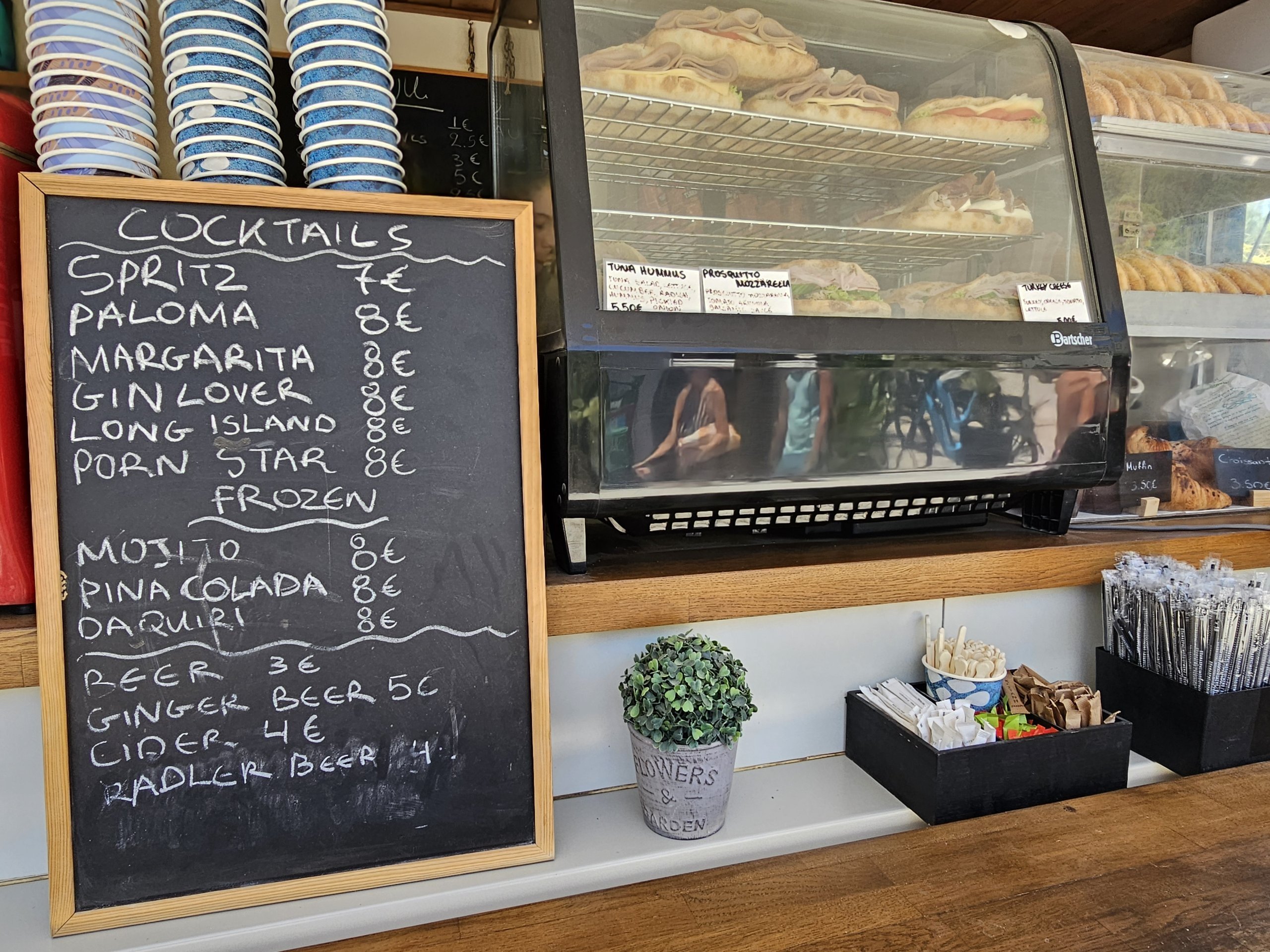 Plajın hemen yukarısında, otoparkın yanında bir klasik restoran (oldukça yüksek fiyatlar - musaka yaklaşık 15 avro) ve fiyatların aksine çok makul olduğu küçük bir bistro (sandviç yaklaşık 6 avro, bu da birçok süpermarketten daha düşük) var.