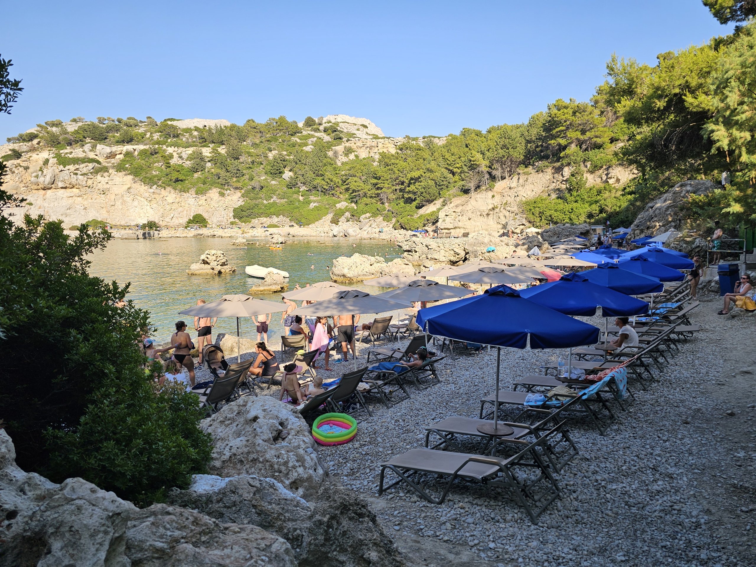 Çoğu insan 9:00 ile 17:00 arasında Anthony Quinn Plajı'ndadır, bundan sonra plaj yavaş yavaş tekrar boşalır, ancak yolcu gemileri yaklaşık 19:30'a kadar ayrılmaz.